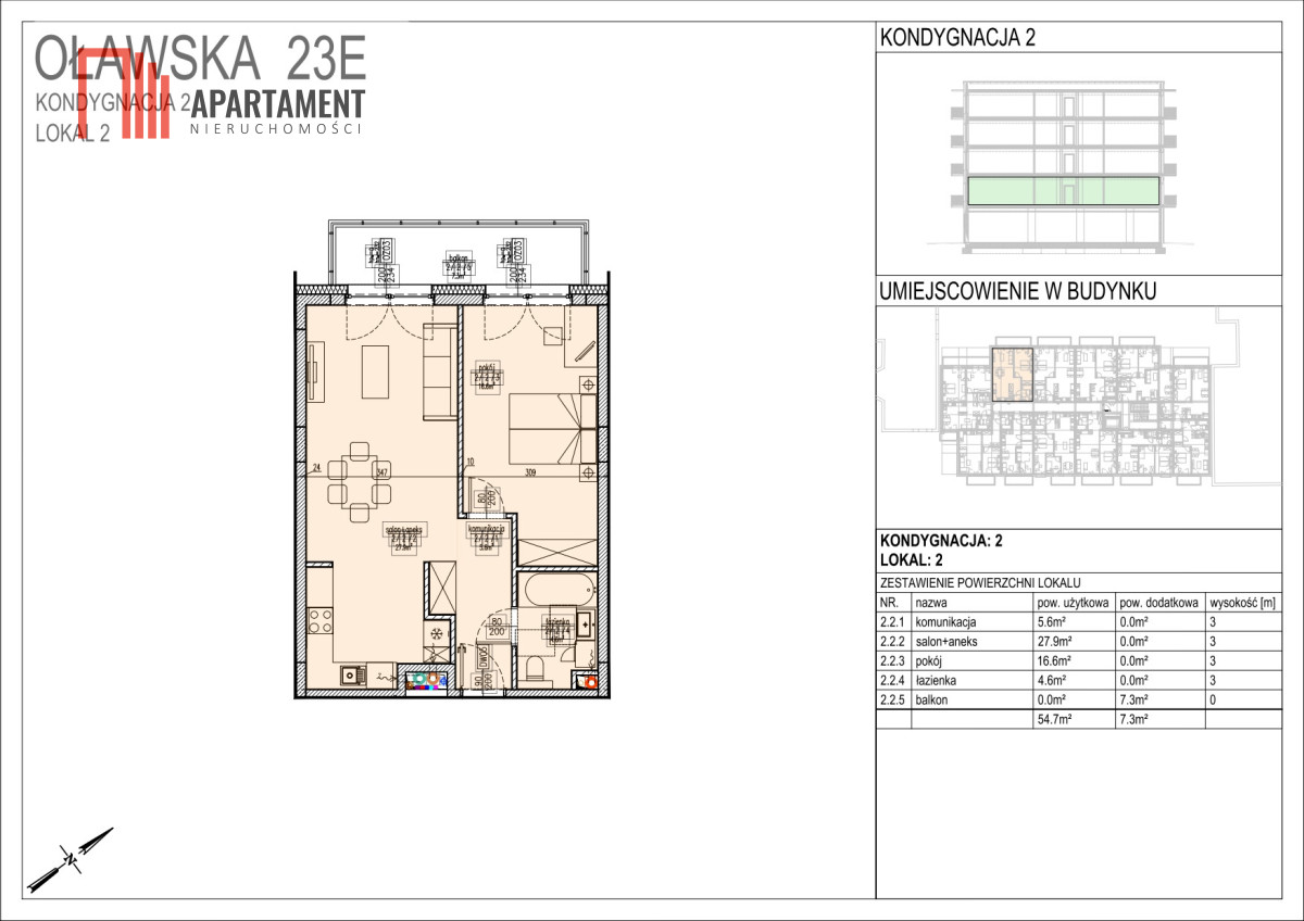 1. korytarz - 7,7 m2 2. salon + kuchnia - 27,3m2 !!! 3. pokój/sypialnia - 7,1 m2 4. pokój/sypialnia - 17,1 4. łazienka - 4,7 m2 5. balkon - 4,9 m2 (nie wchodzi w metraż powierzchni użytkowej) 6. pomieszczenie pomocnicze - 2,6 m2