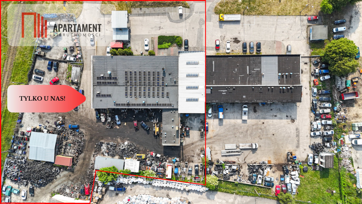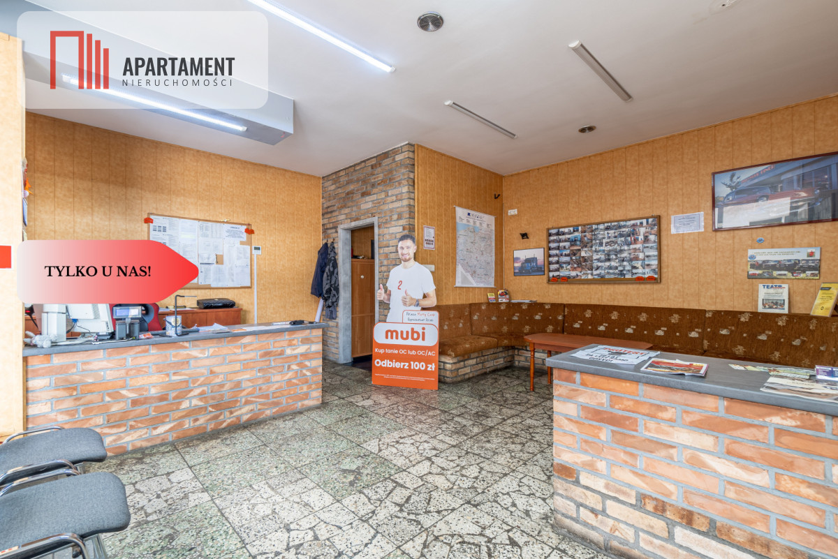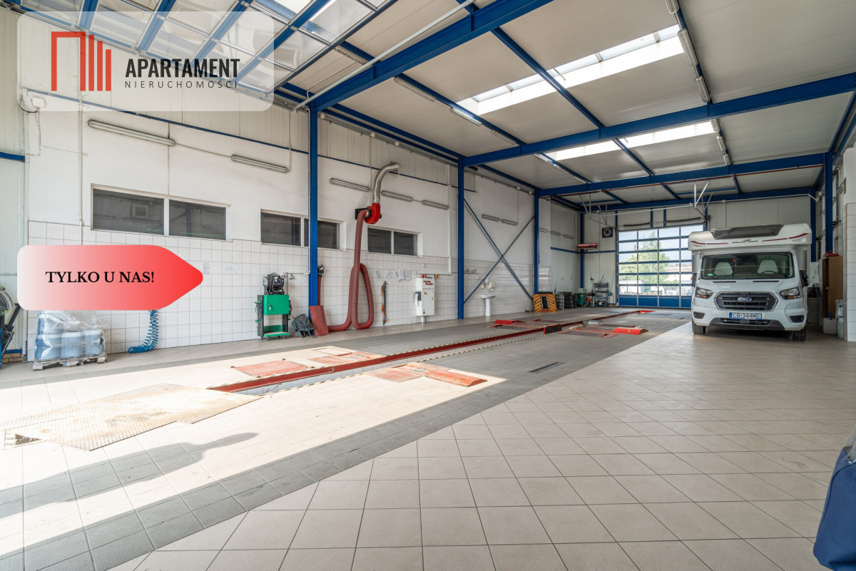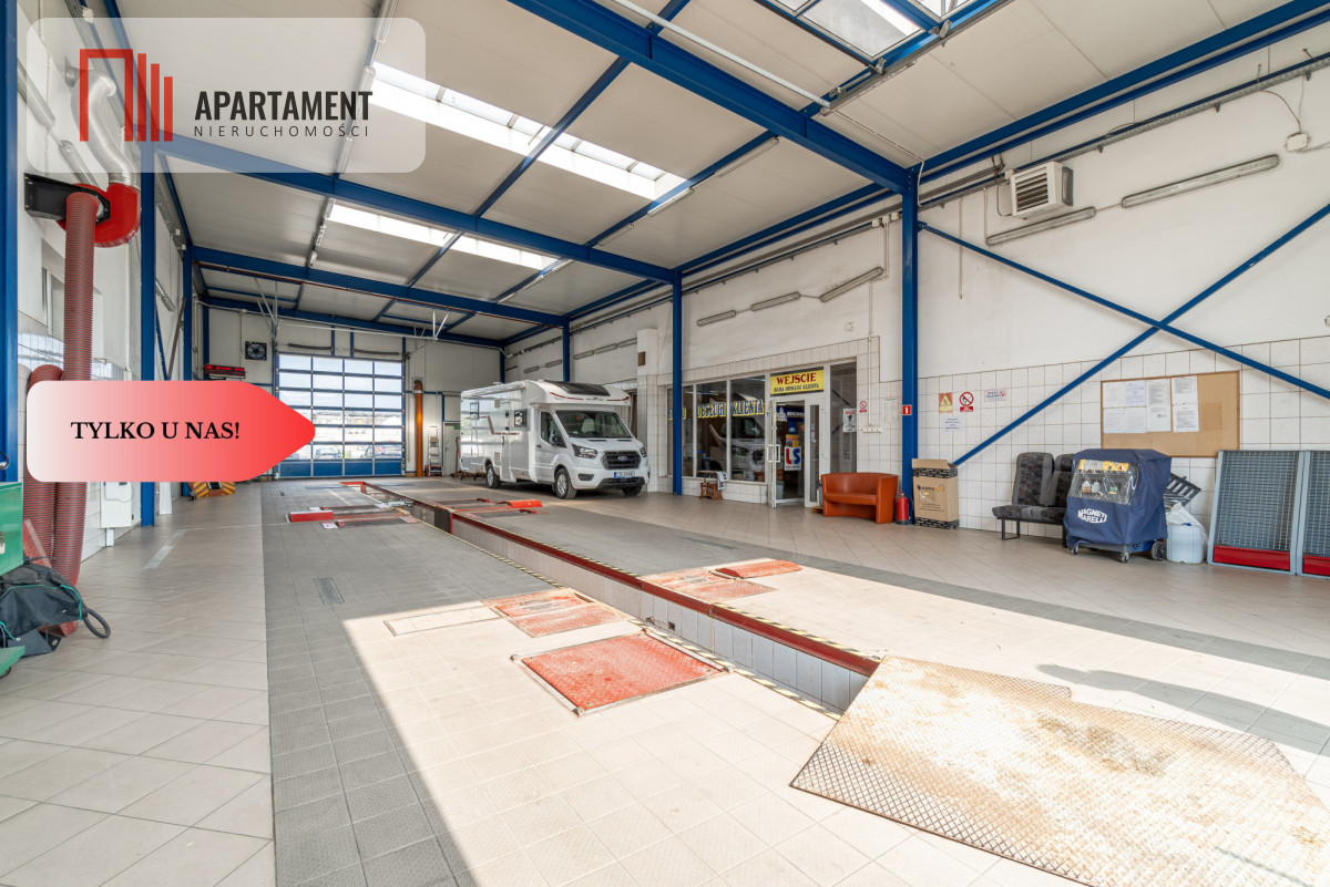 Murowany budynek o powierzchni użytkowej 1050m2, położony na 3 działkach o łącznej wielkości 7165m2, w skład którego wchodzi: - nowoczesna Stacja kontroli pojazdów 250mkw TIR/osobowe stanowisko przelotowe - 25m x 10m, kanał, wysokość 6m - 4 warsztaty mechaniki pojazdowej z podnośnikami ok. 50m2 każdy, 8.50m x 5.80m - duża hala 120m2, 21m x 5.80m z bramą przejezdną 4m wysokości, z kanałem i podnośnikami - pozostałe powierzchnie to recepcja, sklep 80m2, część biurowa, część socjalna, magazynowa i sanitariaty