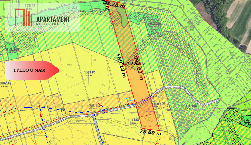 Łączna powierzchnia działek 4,17ha - Przybliżone wymiary łącznie : szerokość 71m, długość 580m - Do działki prowadzi droga publiczna