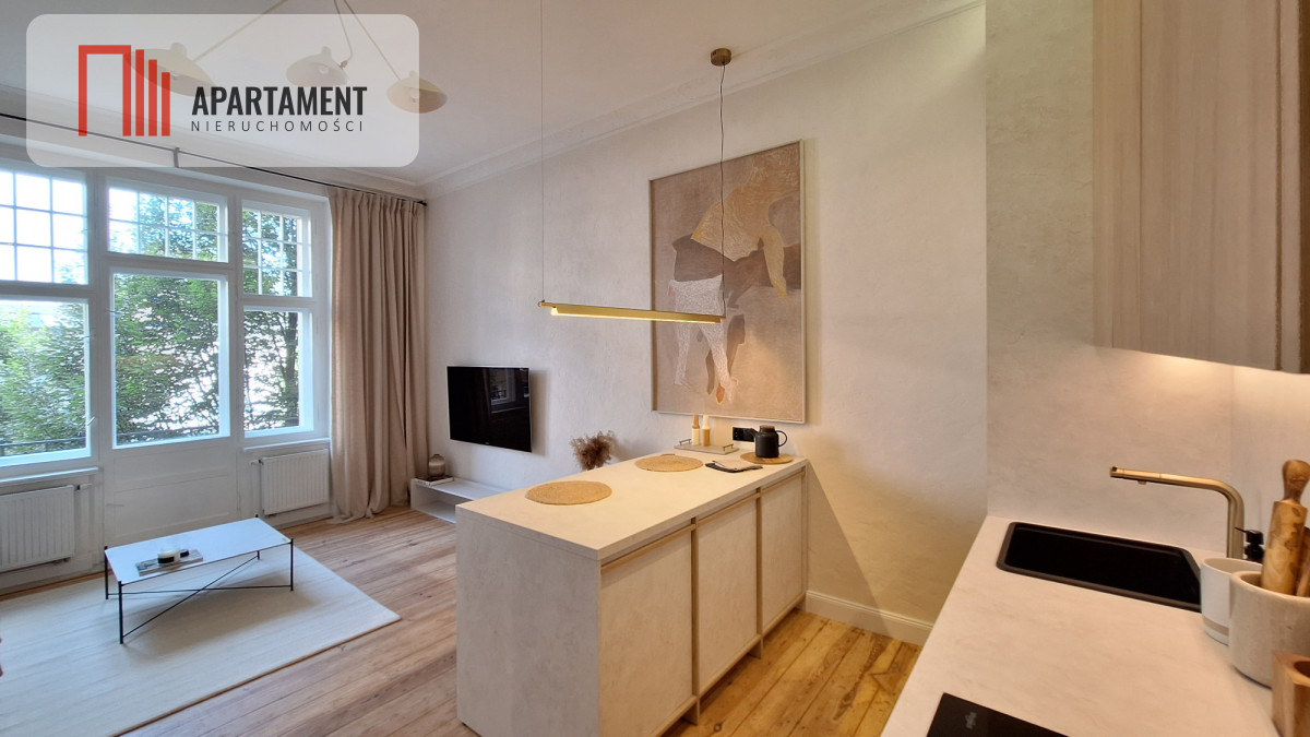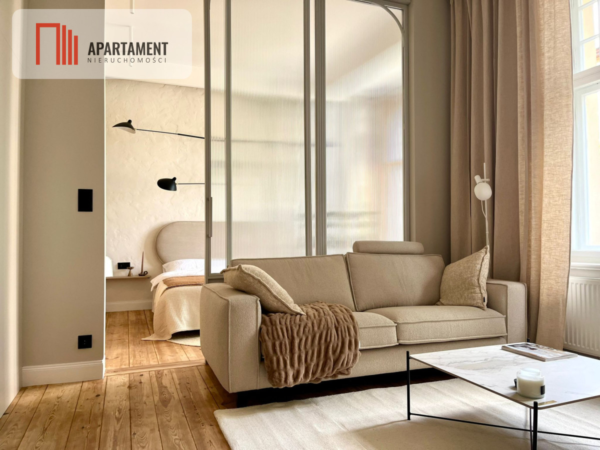 Oferuję wyjątkowy, 2-pokojowy apartament w Śródmieściu, w historycznej kamienicy zlokalizowanej w spokojnej okolicy nieopodal placu Piastowskiego. Apartament GOTOWY DO ZAMIESZKANIA o łącznej powierzchni 46 m2, o następującym układzie pomieszczeń: - kuchnia połączona z salonem - sypialnia, - łazienka, - stylowy balkon otoczony koronami drzew. Do mieszkania przynależy również piwnica. Apartament położony na 1 piętrze w 3 piętrowej kamienicy. Mieszkanie jest bardzo słoneczne, ogromne okna wystawione są na stronę północno-zachodnią. Wszystkie instalacje elektryczne, gazowe i wod-kan zostały wymienione podczas remontu. W kamienicy wymieniane były również piony. Na listopad br. zaplanowany jest remont bardzo przestronnej klatki schodowej. Na terenie patio jest możliwość parkowania samochodu. Do kamienicy przynależy ogród, z którego mogą korzystać mieszkańcy. Mieszkanie zostało zaprojektowane przez biuro projektowe MUUTTAA i zrealizowane w 100% wg założeń projektowych. Wszystkie elementy wyposażenia i dekoracyjne widoczne na zdjęciach pozostają w mieszkaniu. Zastosowano wszystkie materiały z półki premium. Założeniem projektowym było odzyskanie wszelkich możliwych elementów historycznych (tj. drewniane deski podłogowe, przepiękne drewniane okna dwuskrzydłowe oraz sztukaterie, które zostały odrestaurowane i zmodernizowane) i zestawienie ich z nowoczesnymi materiałami oraz formami przy zachowaniu stylistyki kamienicy. Na ścianach w salonie i sypialni zastosowano naturalny tynk gliniany. Ściana łącząca salon z sypialnią została zastąpiona stalową konstrukcją z przeszkleniem hartowanym flutes, z drzwiami przesuwnymi, co daje efekt luksusu i wpuszcza dodatkową ilość światła do obu pomieszczeń. Zasłony zostały uszyte na zamówienie z tkaniny lniano-wiskozowej. Wezgłowie zostało wykonane z naturalnej tkaniny włoskiej lniano-bawełnianej. Stoliki kawowy i boczny w sypialni z drewna olchowego są projektami autorskimi wykonanymi na zamówienie. Meble wykonała renomowana firma stolarska z zastosowaniem najwyższej jakości mechanizmów i okładzin wg projektu firmy MUUTTAA. Wszystkie płytki są produkcji włoskiej. Jestem przekonany, że ta oferta stanowi perełkę na rynku nieruchomości i trafi w ręce wymagającego klienta, którego zachwyci każdy element tej przestrzeni. Serdecznie zapraszam na prezentacje.