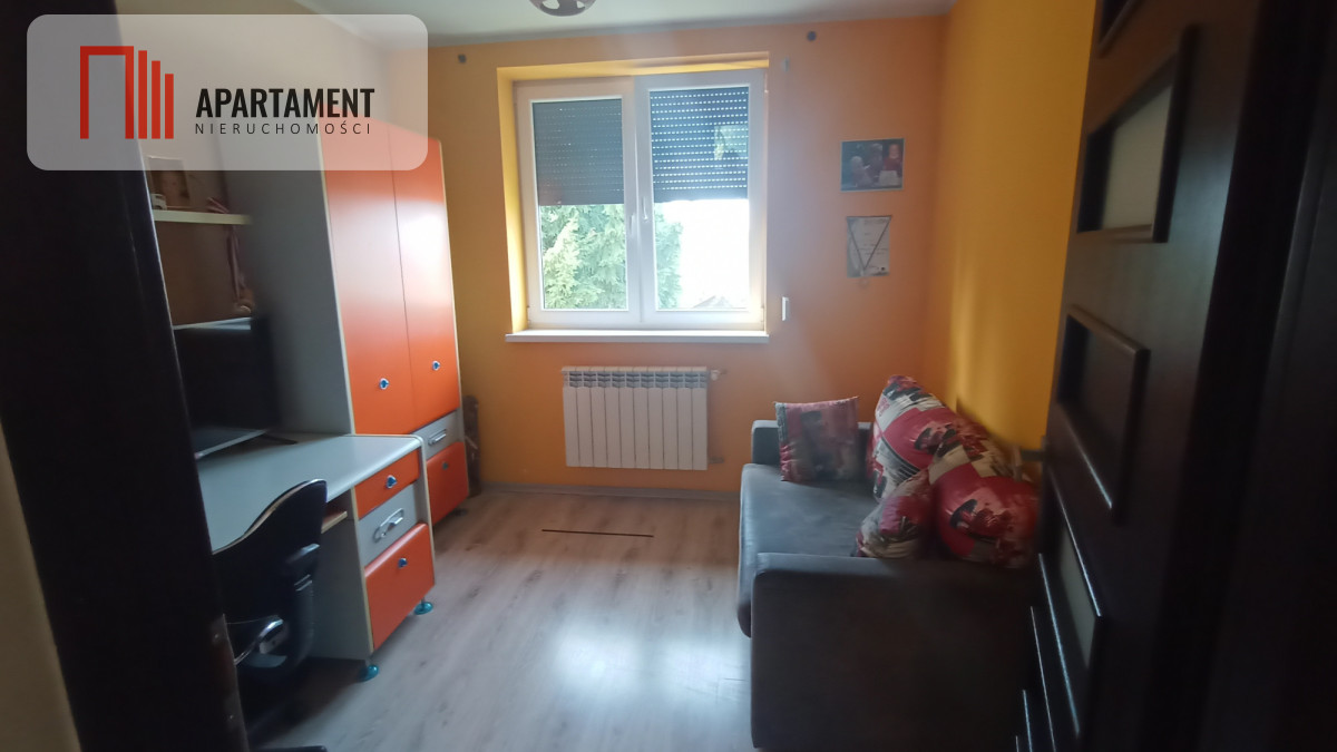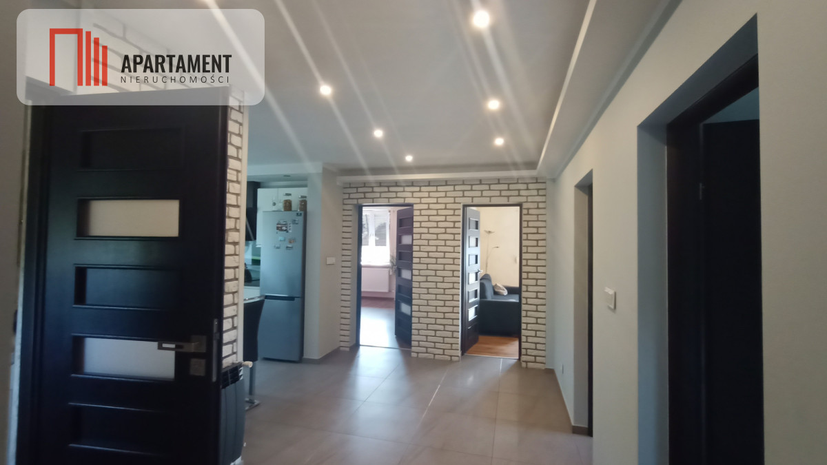 wiatrołap, duża przechodnia kuchnia, duża sypialnia, dwie mniejsze sypialnie dziecięce, pokój dzienny/salon z wyjściem na balkon.