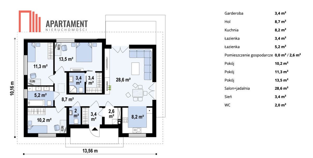 - salon z jadalnią i aneksem kuchennym o pow. 36,8 m2 , - łazienka główna o pow. 5,2 m2 , - łazienka o pow. 3,4 m2 , - hall o pow. 8,7 m 2 , - pomieszczenie gospodarcze o pow. 2,6 m2 - pokój o pow. 10,2 m2 - pokój o pow. 11,3 m2 - pokój o pow. 13,5 m2 - wiatrołap o pow. 3,4m2 - WC o pow. 2 m2