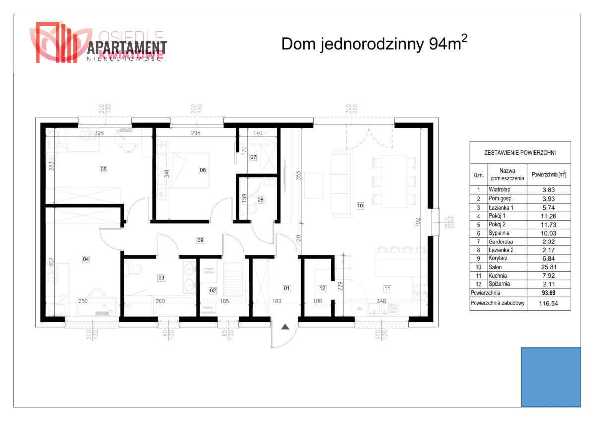1. Salon + Kuchnia o powierzchni 33,73 m² 2. Wiatrołap 3,83 m² 3. Pomieszczenie gospodarcze 3,93m² 4. Spiżarnia 2,11m² 5.Holl 6,84 m² 6. Łazienka1- 5,74m² 7. Łazienka 2 - 2,17m² 8. Sypialnia 10.03 m² 9. Garderoba 2,32 m² 10. Pokój 11,26 m² 11. Pokój 11,73 m²
