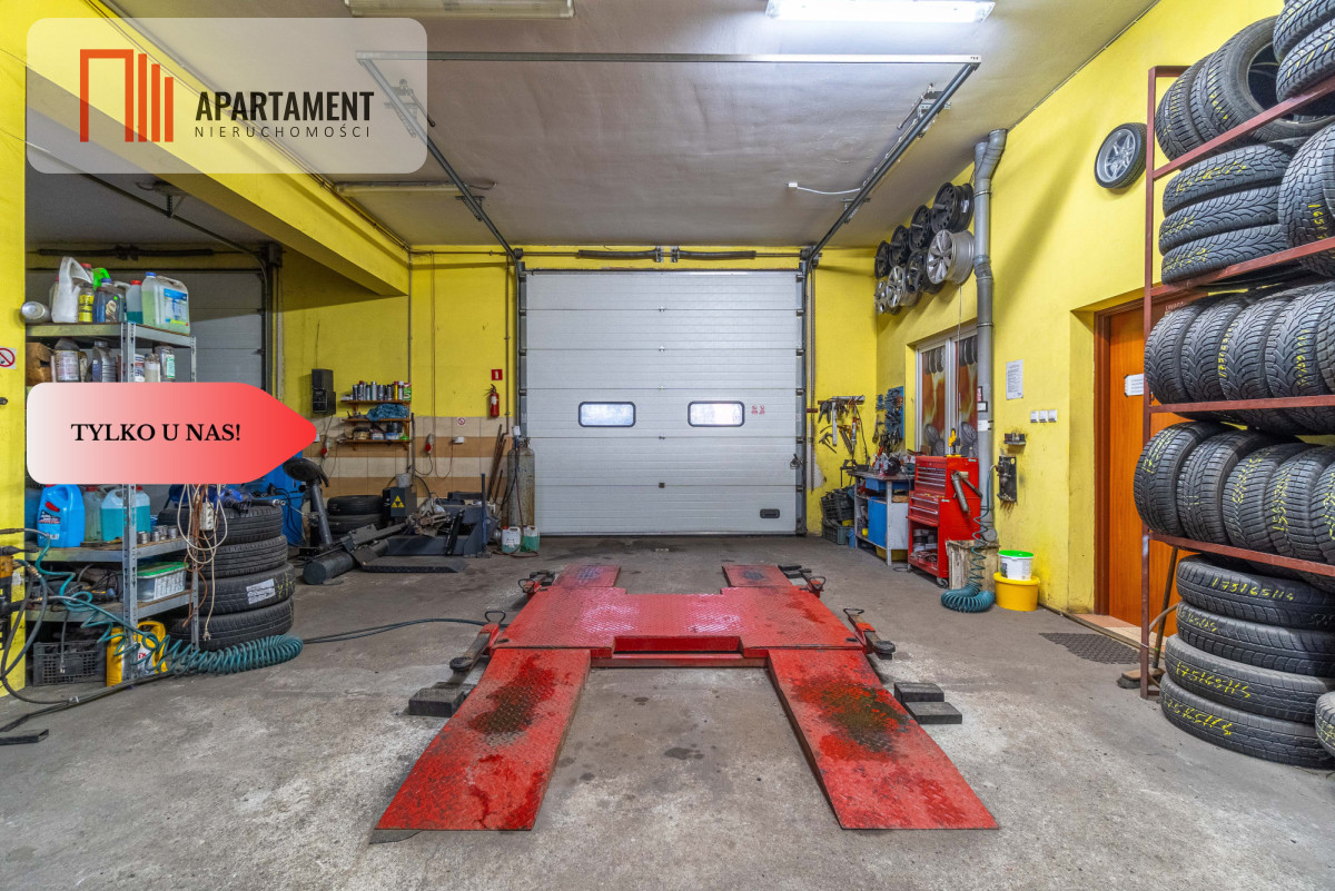 Kompletnie wyposażony warsztat 112m2 (kanał na całej długości, duże bramy wjazdowe) Pomieszczenia socjalne, magazynowe, szatnia, biuro/sklep, poczekalnia WC dostosowane dla osób niepełnosprawnych