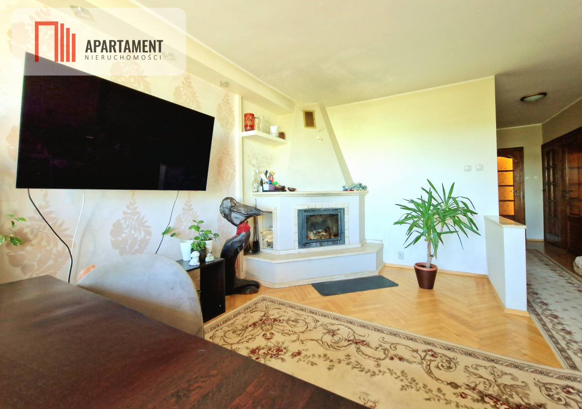 przestronny i słoneczny salon z kominkiem oraz wyjściem na duży taras- 35 m2,