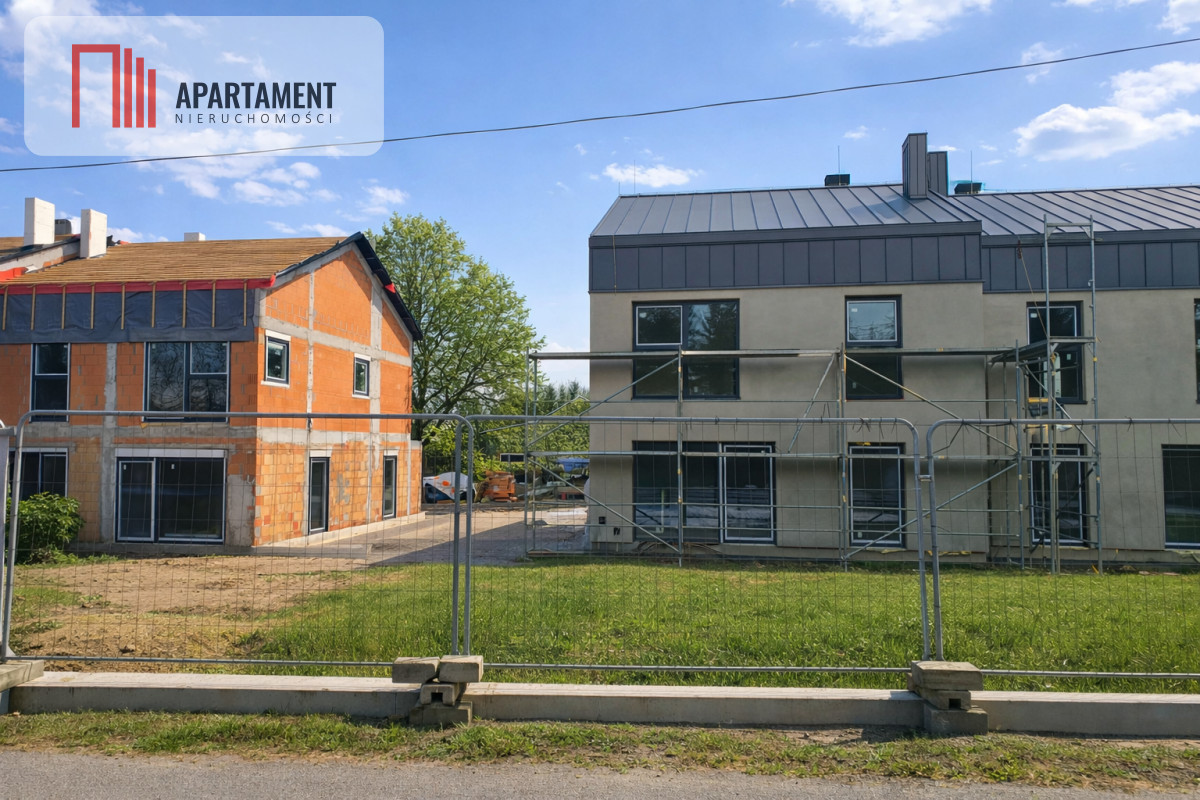 Strop żelbetowy, schody zabiegowe prefabrykowane, na parterze i na piętrze tynki na ścianach oraz sufitach zagruntowane i wybiałkowane, dach ocieplony pianką PUR, płyty GK na poddaszu, wylewki podłogowe na obu kondygnacjach, ogrzewanie podłogowe na obu kondygnacjach, okna PCV trzyszybowe z ciepłym montażem i nawiewnikami higrosterowalnymi, rolety automatyczne w każdym oknie, rozprowadzona elektryka, kanalizacja, woda, ogrzewanie - pompa ciepła Beretta 8 kW, uzdatniacz wody. Dach - blacha panelowa Blachotrapez, balkony wykończone elegancką balustradą szklaną. Całkowicie wykończony teren wspólny: wjazd na posesję przez automatyczną bramę marki Wiśniowski z napędem firmy Nice, drogi wewnętrzne i miejsca parkingowe zewnętrzne wyłożone płytą ażurową.Dodatkowo, domy będą miały gotowe tarasy z wysokiej klasy płytki antypoślizgowej. W ogródku nawieziemy czarnoziem, dzięki czemu ta przestrzeń będzie od razu gotowa do własnej aranżacji. W częściach wspólnych sadzimy tuje i jabłonie.