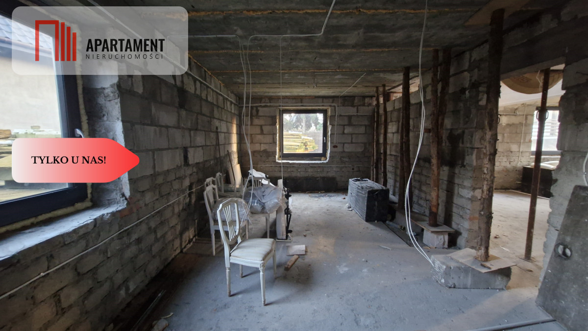 wykonane wszystkie kluczowe prace konstrukcyjne, nowe pokrycie dachowe, zamontowana stolarka okienna i drzwiowa, rozprowadzona instalacja elektryczna, przygotowana instalacja internetowa, częściowo wykonane tynki wewnętrzne.