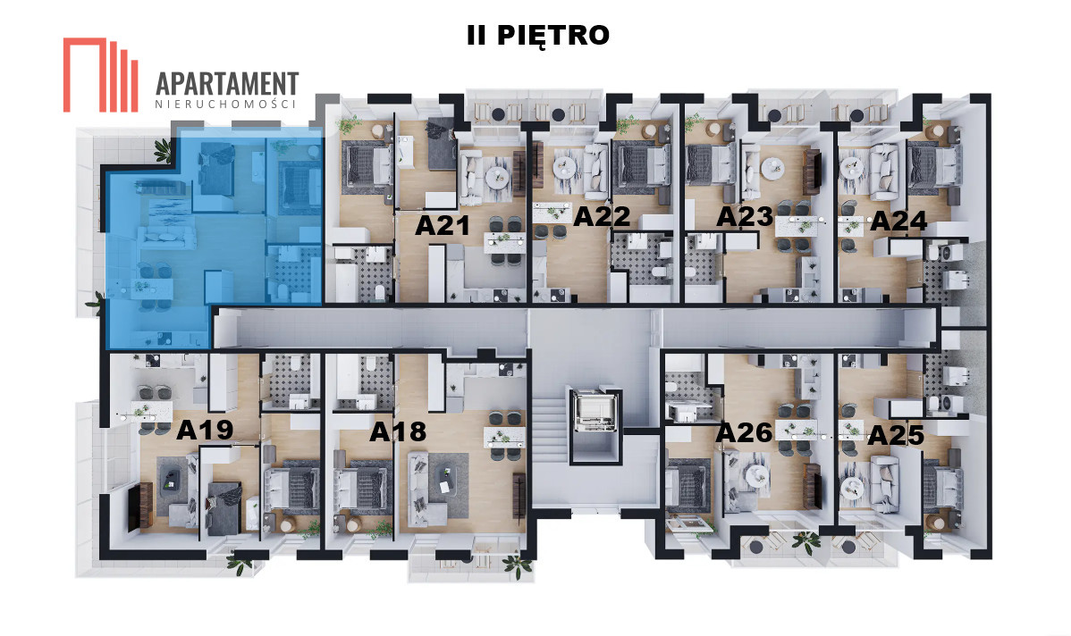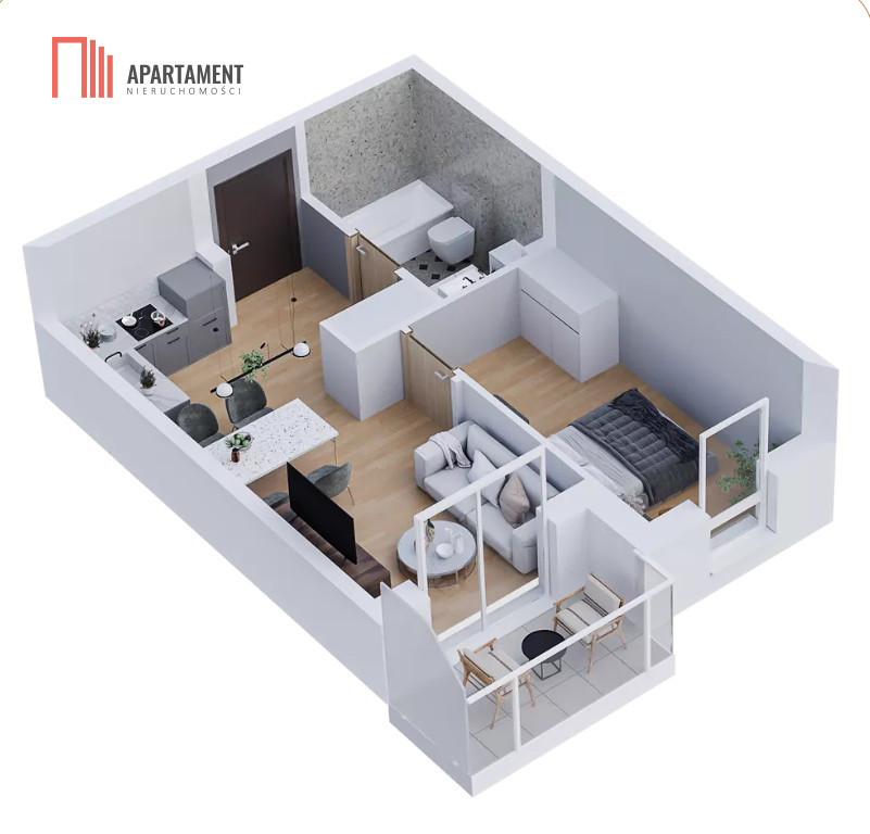 Nieruchomości Apartament prezentują 2 pokojowe mieszkanie pow. 34,80 m² w stanie deweloperskim w nowoczesnym budynku.