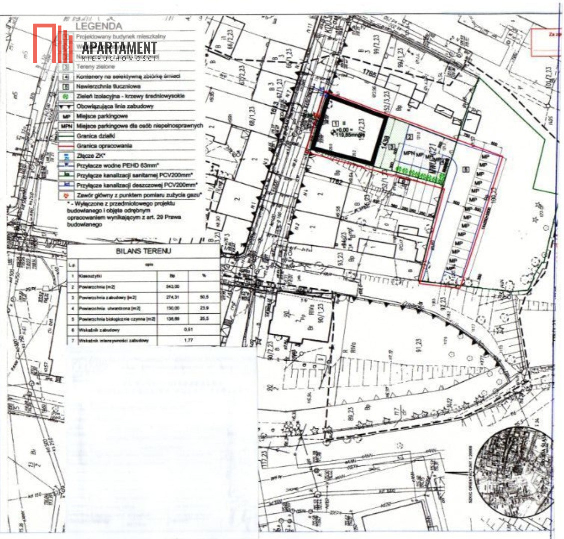 wraz z prawomocnym pozwoleniem na budowę oraz gotowym projektem architektonicznym czterokondygnacyjnej kamienicy. Budynek został zaprojektowany z myślą o funkcji mieszkalno-usługowej i składa się z 18 lokali