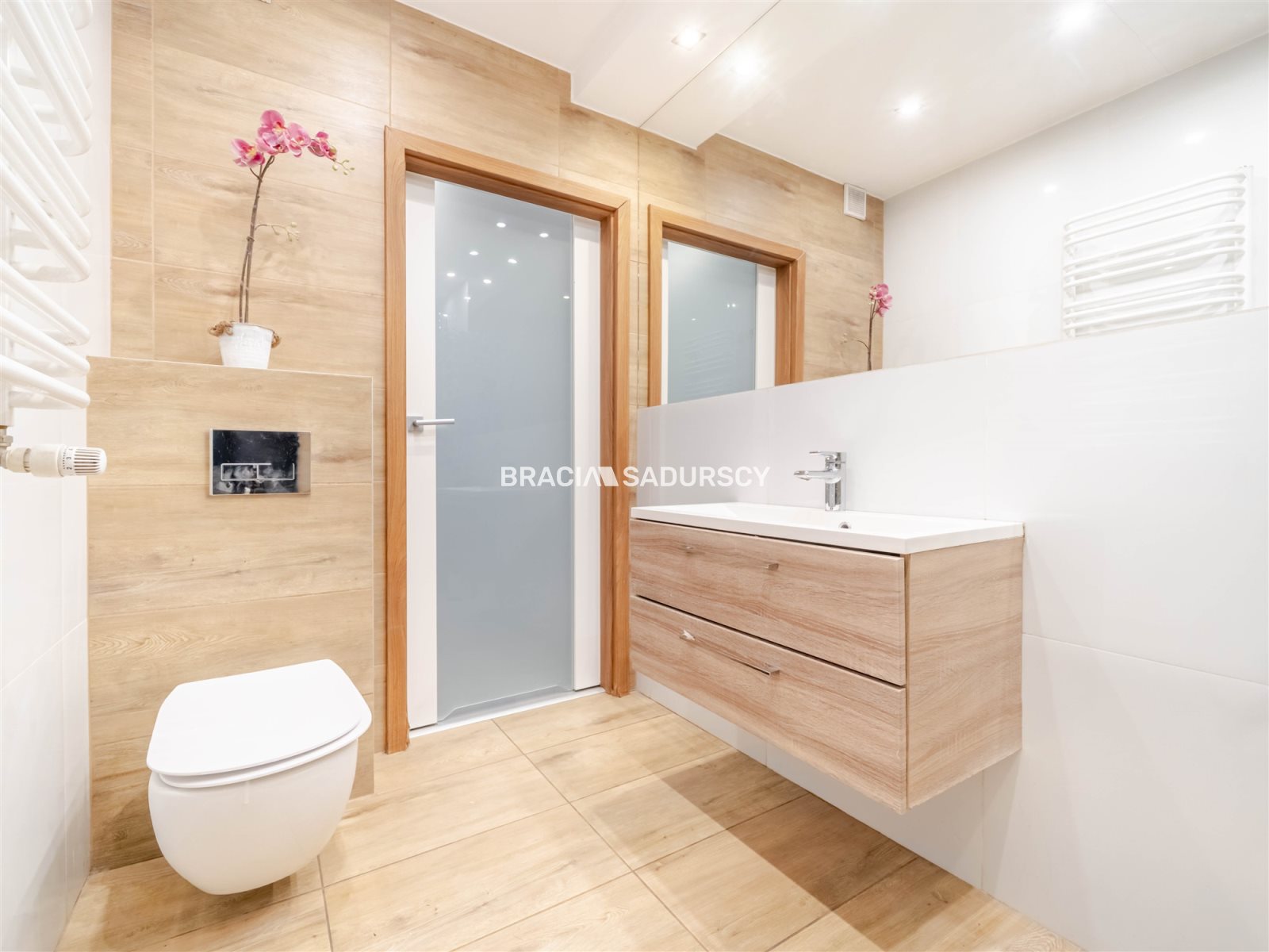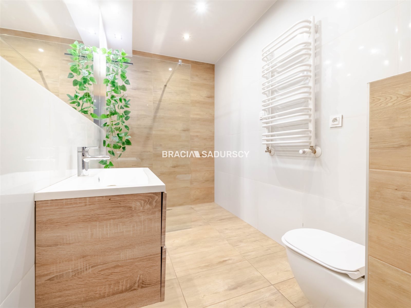 Łazienka z wygodną kabiną prysznicową w ponadczasowej kolorystyce.