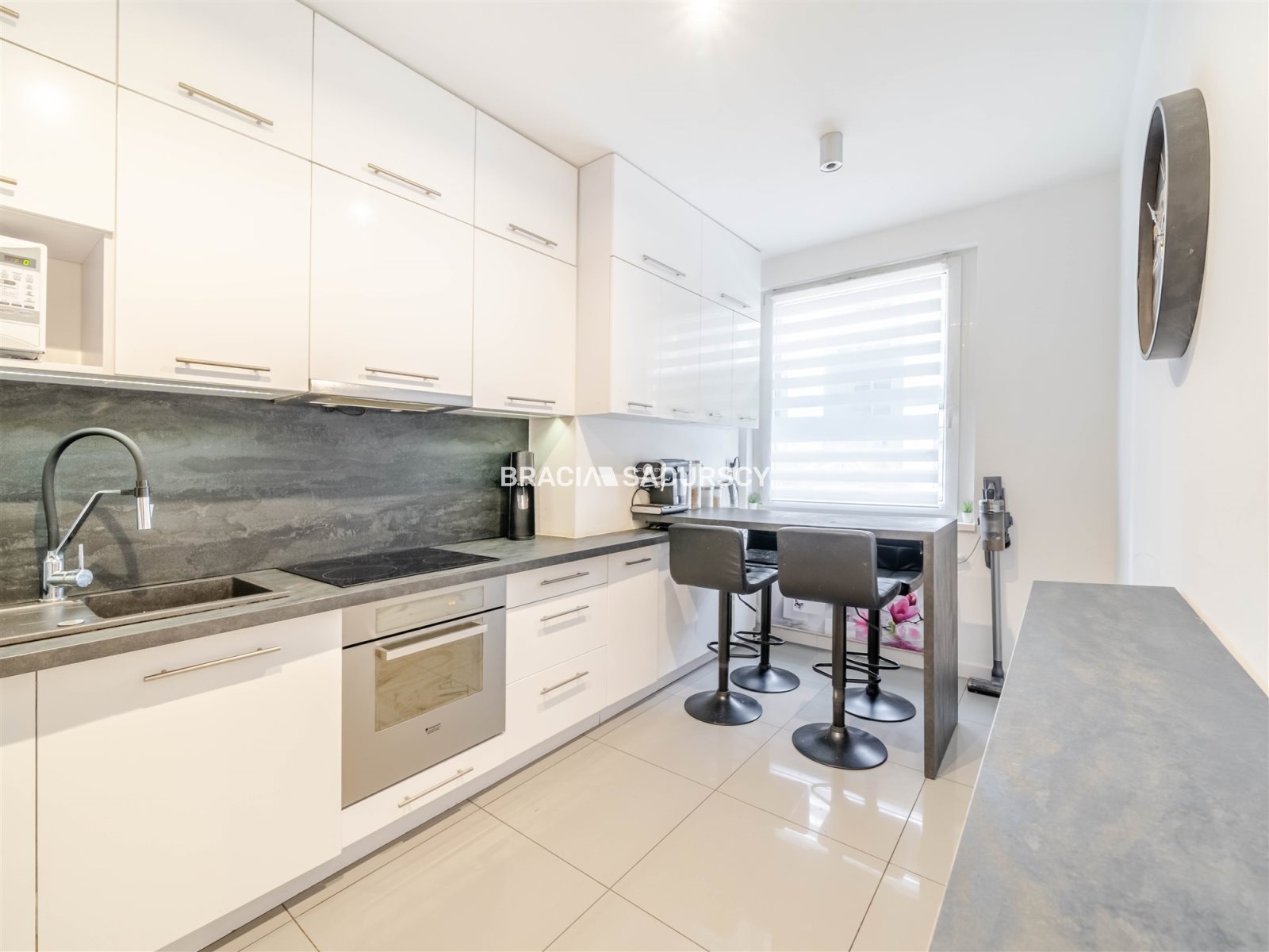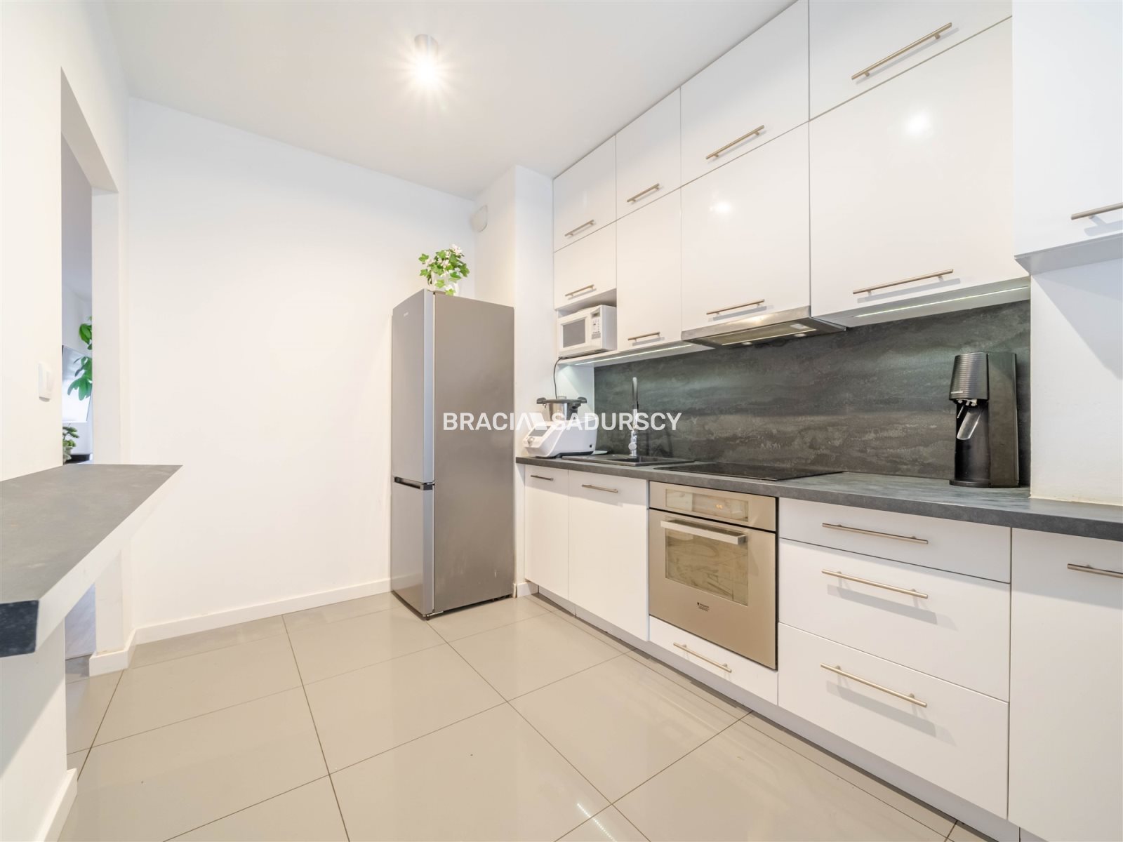 Kuchnia oddzielna, jasna, z oknem z nowoczesną zabudową oraz sprzętem AGD (piekarnik, płyta indukcyjna, okap, lodówka z zamrażarką, zmywarka).