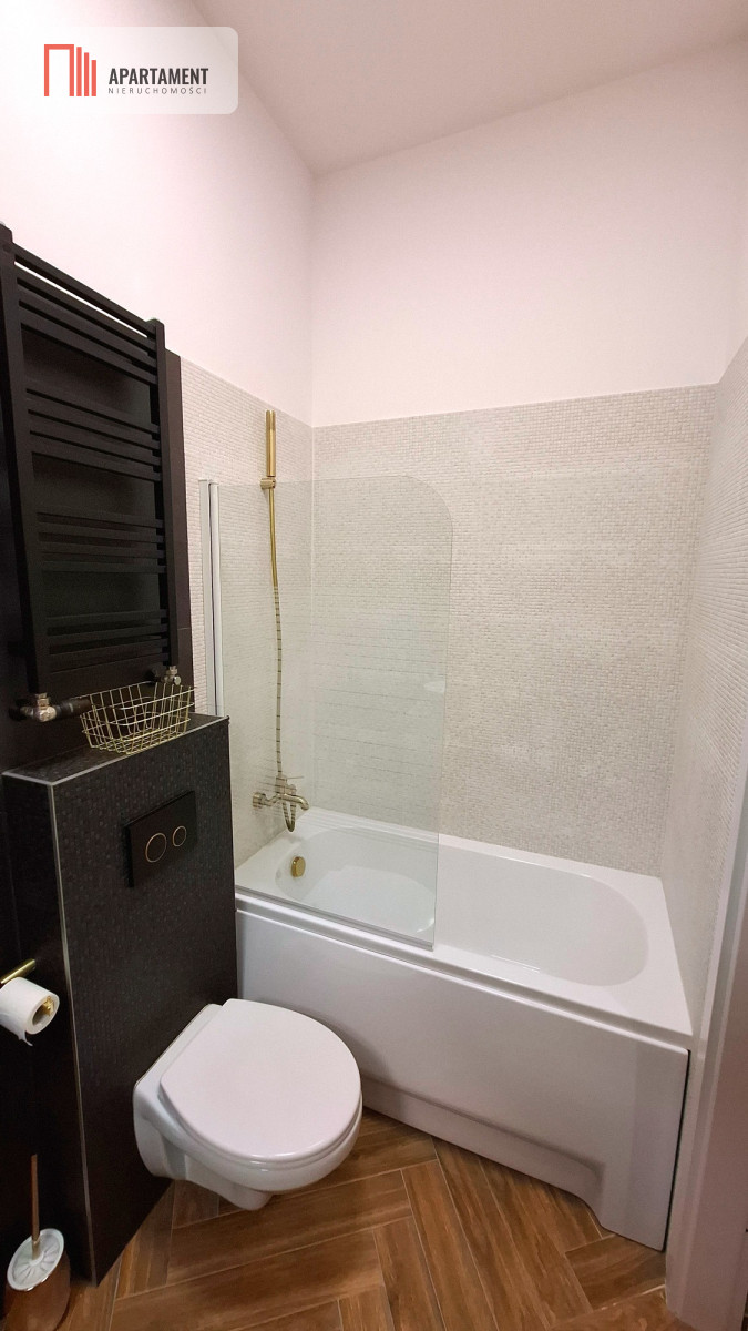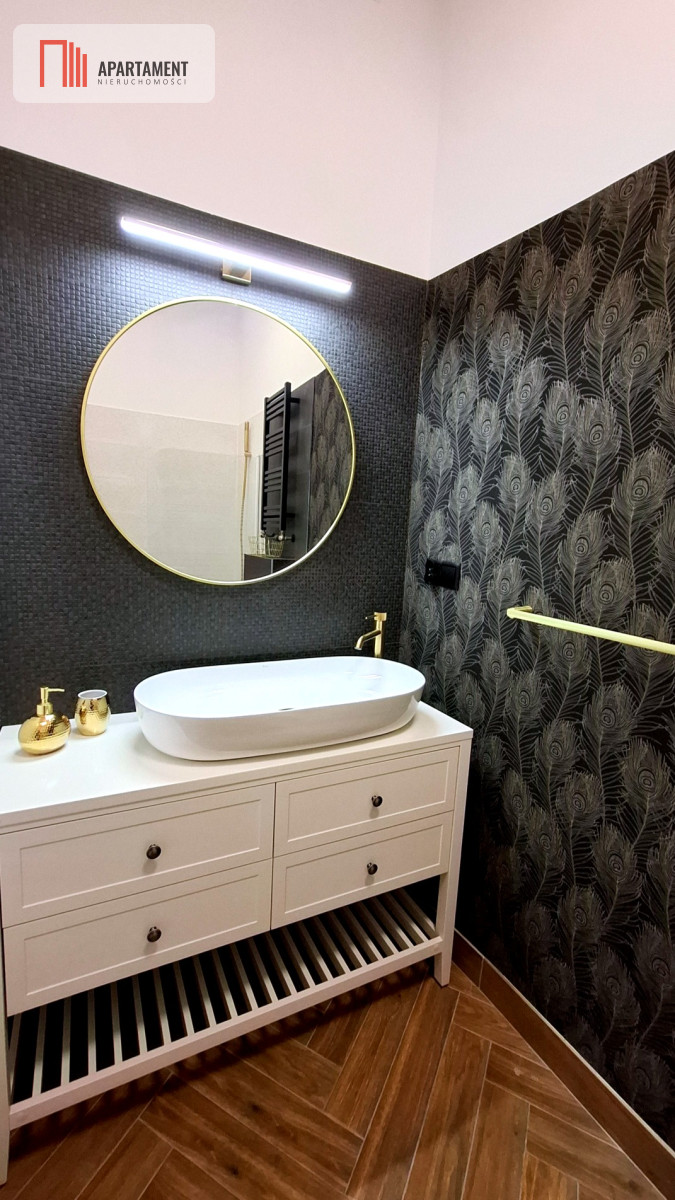 - Stylowej łazienki z toaletą, wanną z przeszkleniem i złotymi dodatkami - wysoki standard wykończenia z elementami glamour. Duże lustro, designerska armatura oraz klimatyczne oświetlenie podkreślają elegancję tej przestrzeni.