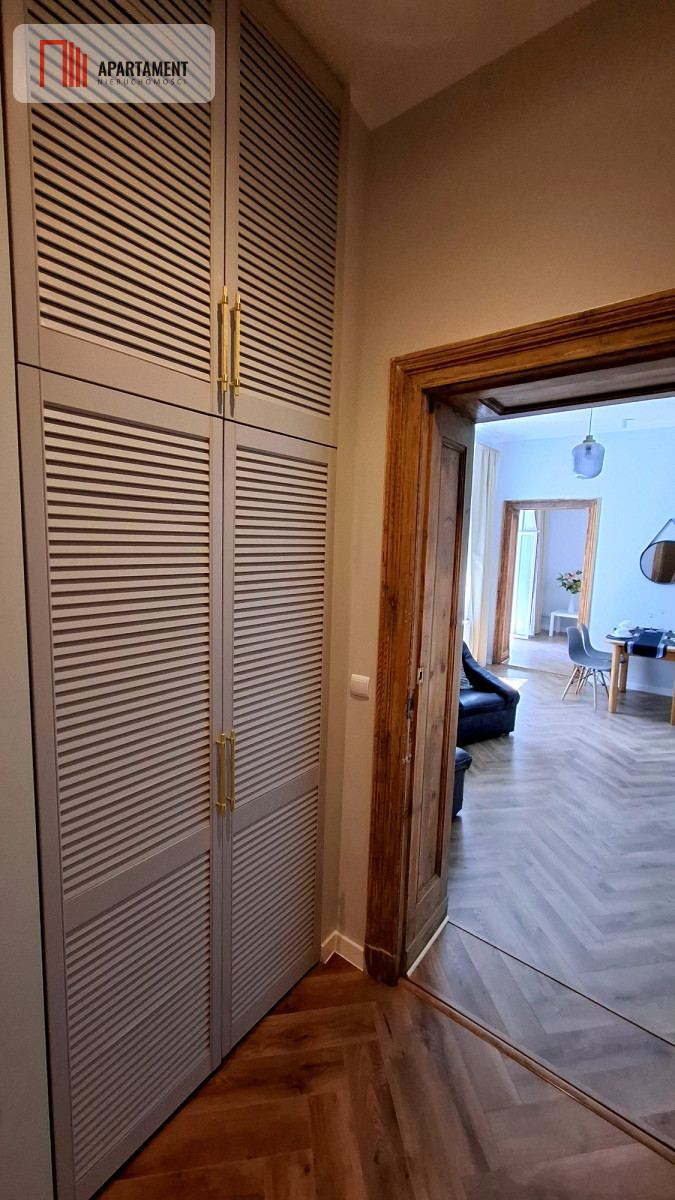 - Przestronnego salonu z aneksem z dużymi oknami i częścią jadalnianą - idealne miejsce do wypoczynku i spotkań z bliskimi. Wnętrze urządzone w przytulnym, nowoczesnym stylu z zachowaniem elementów charakterystycznych dla kamienic, takich jak wysokie sufity i oryginalne drewniane futryny i drzwi.
