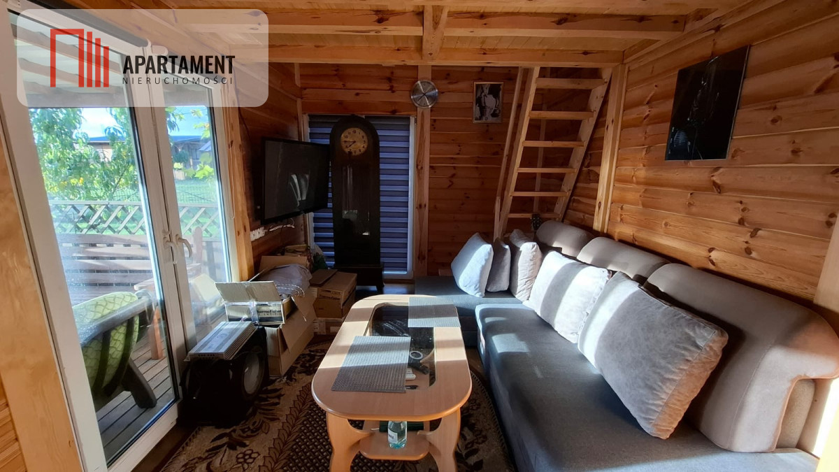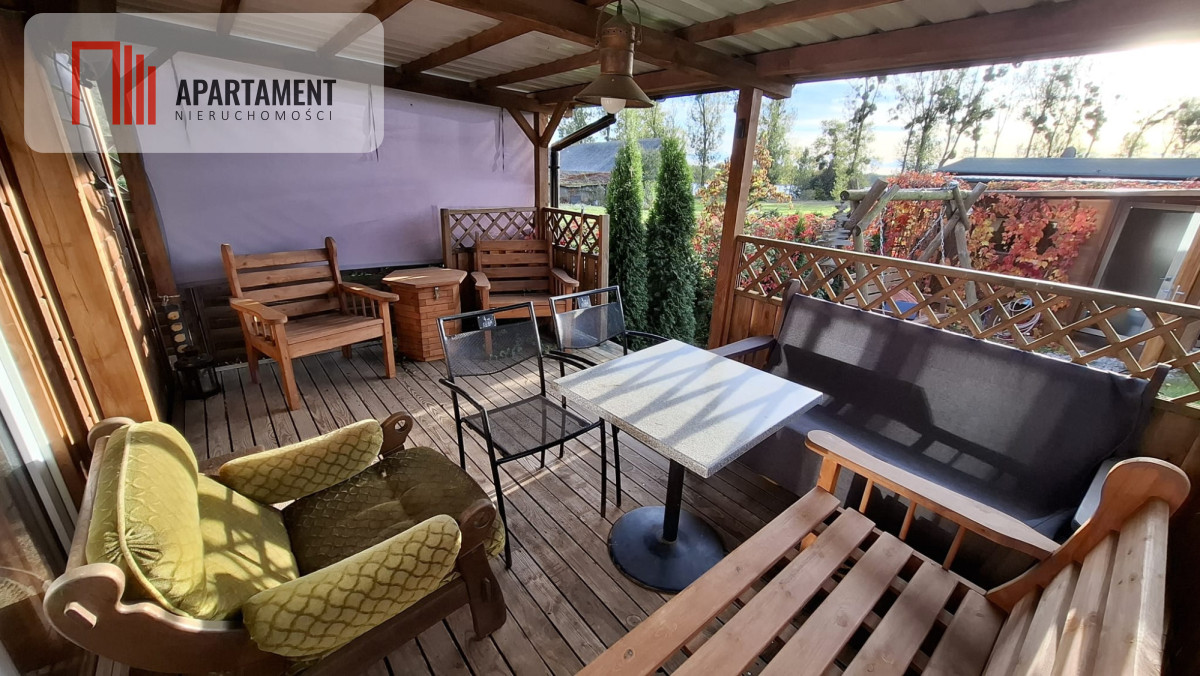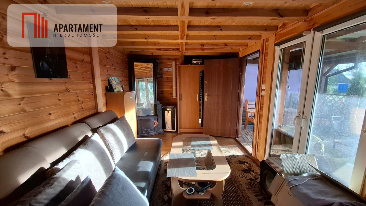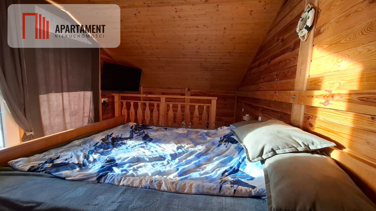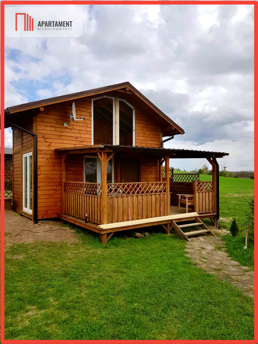 - Ocieplony drewniany domek mieszkalny z salonem, sypialnią i 2 tarasami, w tym jeden z widokiem na jezioro.