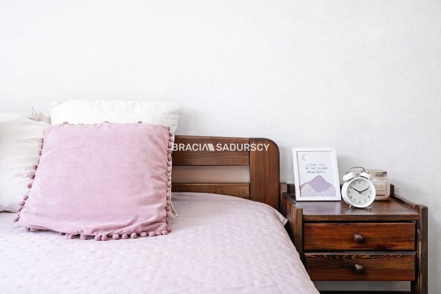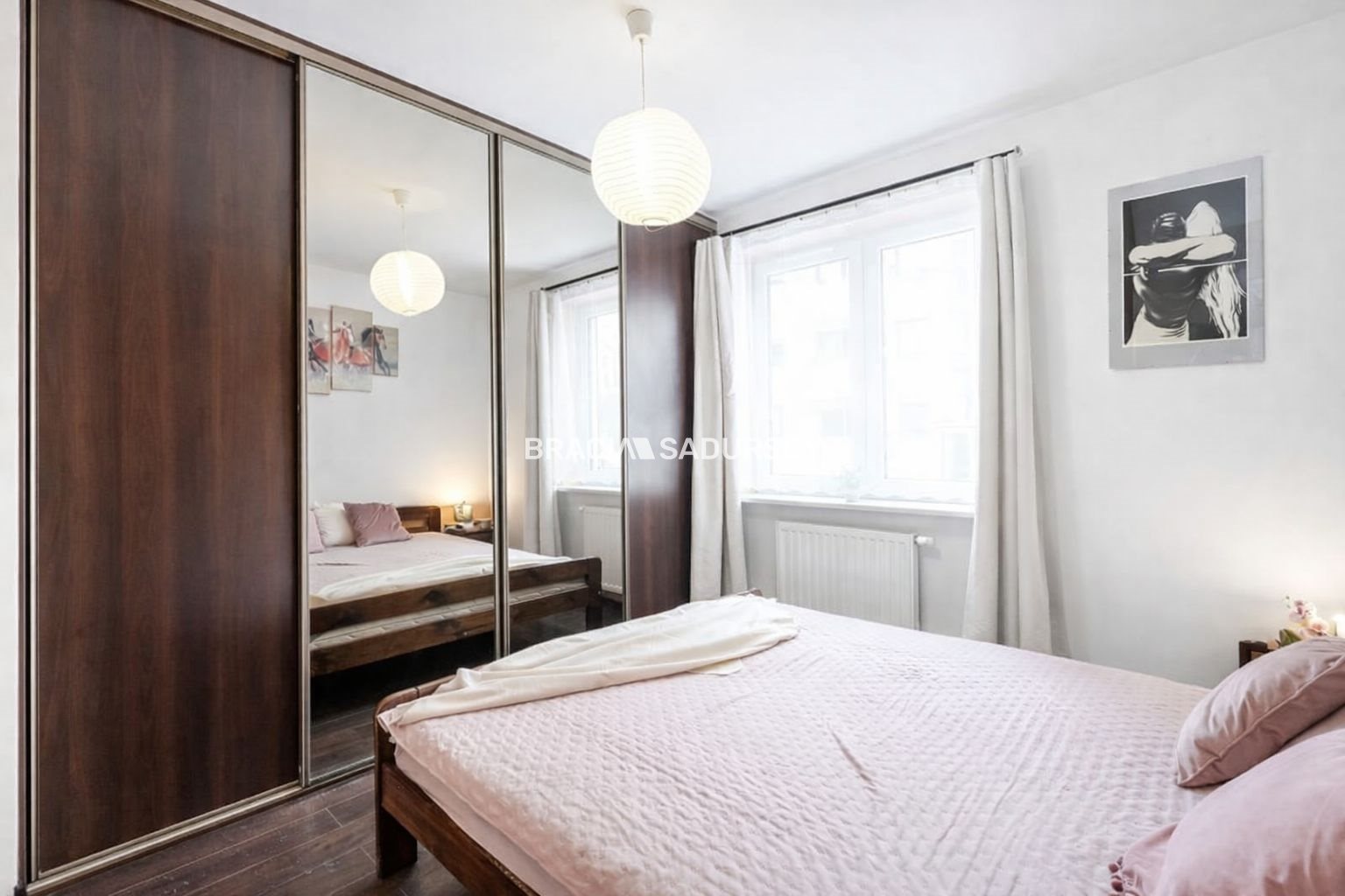 Przytulna i ustawna, z dużym łóżkiem oraz pojemną, zabudowaną garderobą z czterema drzwiami, w tym dwoma lustrzanymi, które optycznie powiększają przestrzeń.