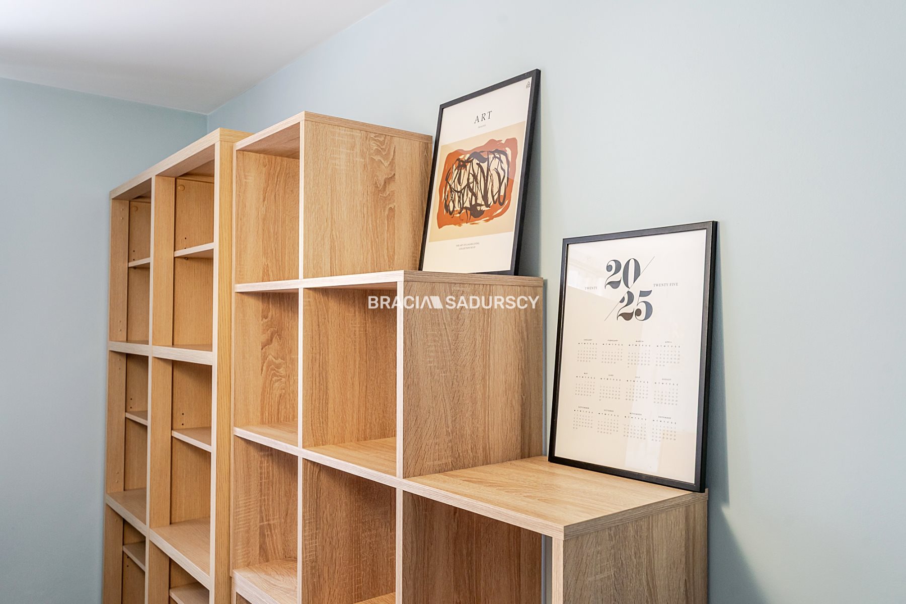 Idealny home office - wyposażony w biurko i regały.