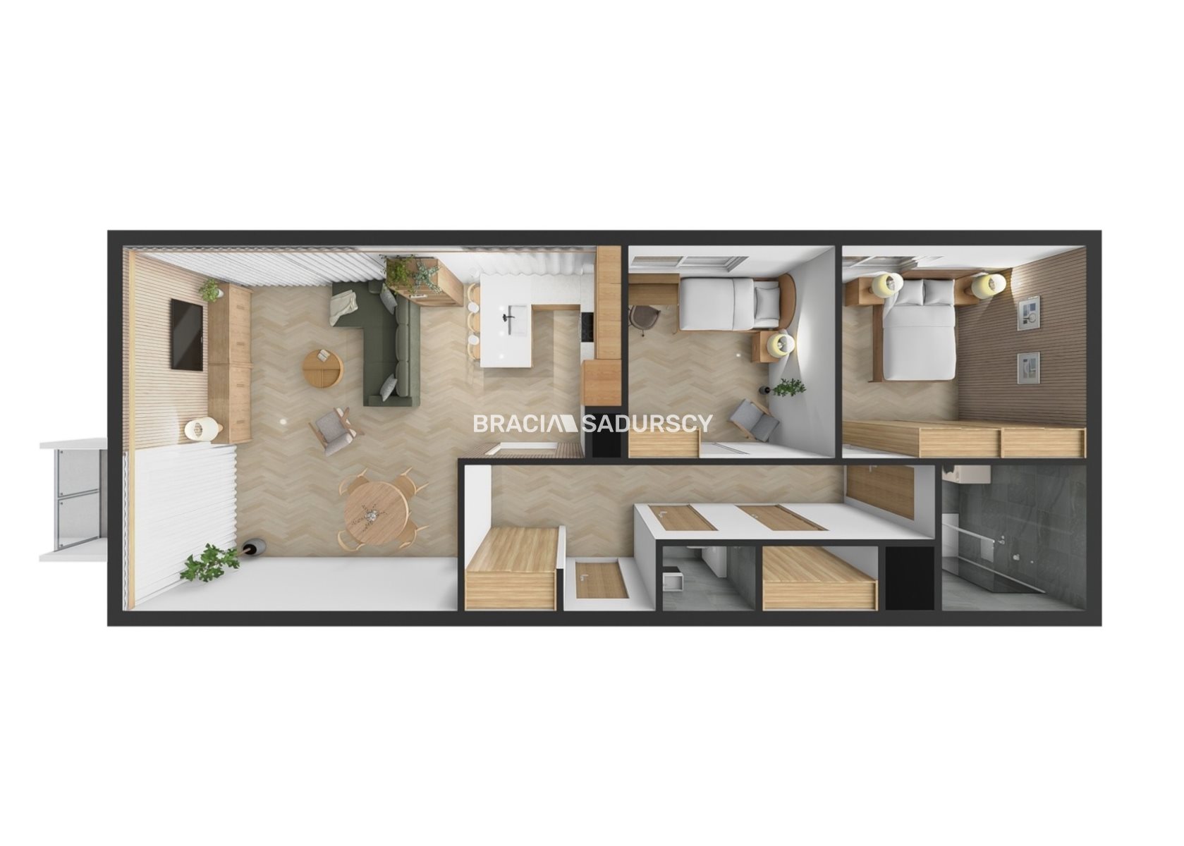 Układ mieszkania daje możliwość zmiany aranżacji i doprowadzenia go do pierwotnego stanu, w tym połączenia dwóch pokoi w jedną większą przestrzeń dzienną.