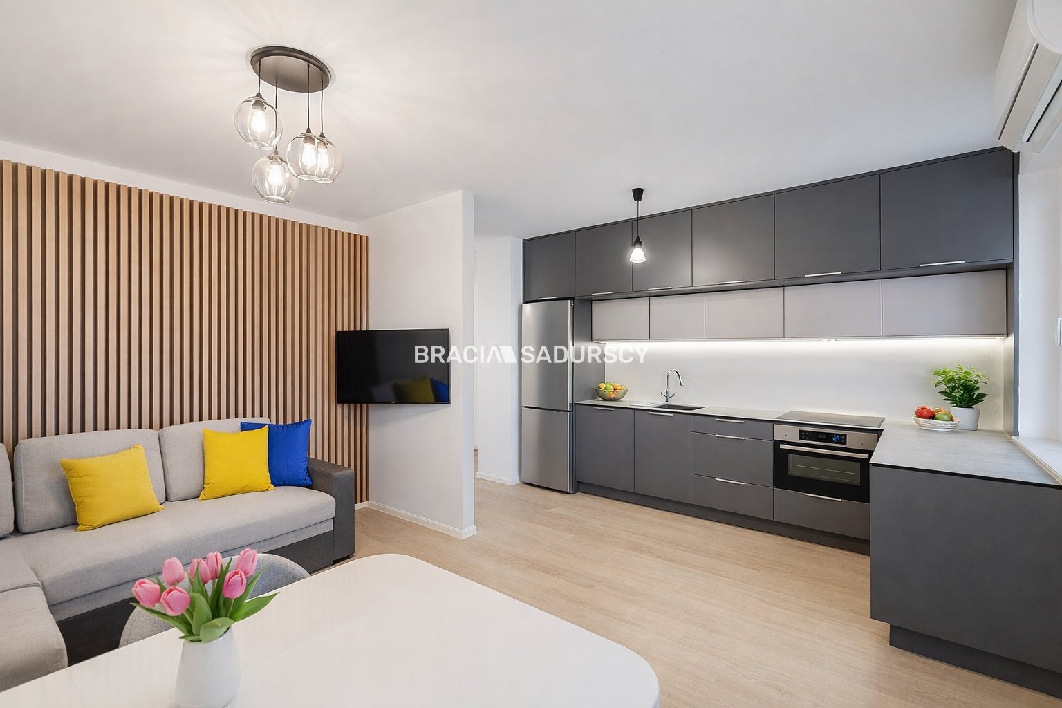 Sercem mieszkania jest przestronny salon z aneksem kuchennym , który tworzy wygodną strefę dzienną do wspólnego spędzania czasu. Z salonu można wyjść na duży balkon o charakterze tarasu , idealny do relaksu, porannej kawy czy spotkań z bliskimi. Dodatkowy balkon dostępny jest również z sypialni.