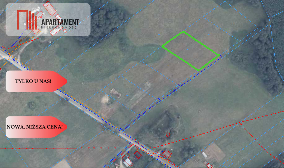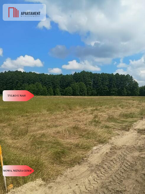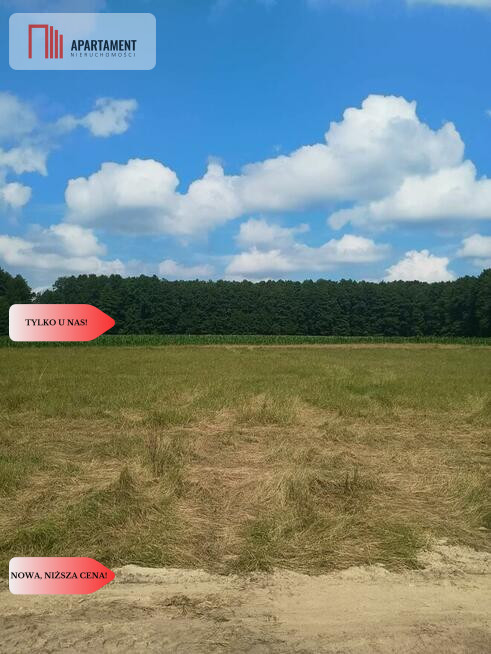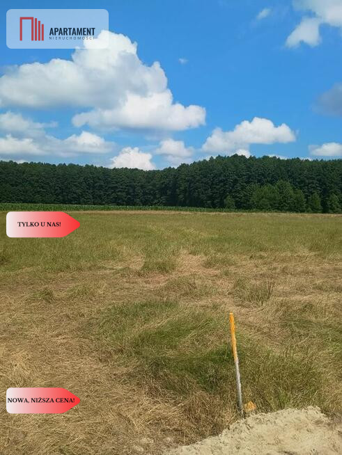 Wymiary działki to ok. 40m x 75m. Teren jest płaski, pokryty niską roślinnością charakterystyczną dla łąki.
