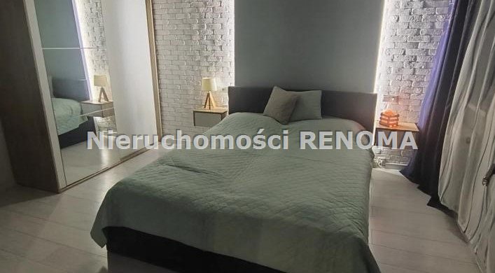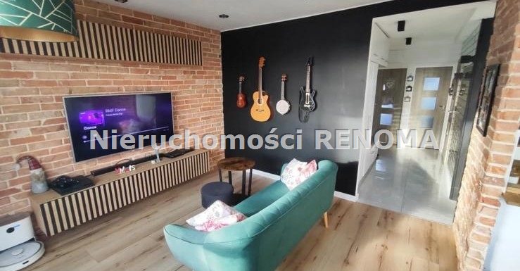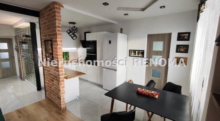 Wnętrza zostały urządzone w spójnym stylu, łączącym nowoczesne rozwiązania z elementami retro i subtelną nutą industrialną. Przestrzeń dzienną zdobi efektowna ściana z oryginalnej, ponadstuletniej cegły, przełamana kontrastową czernią i ocieplona dębowymi dodatkami. W pozostałych pomieszczeniach zastosowano parapety kamienne, a całość dopełniają podwieszane sufity z oświetleniem punktowym.