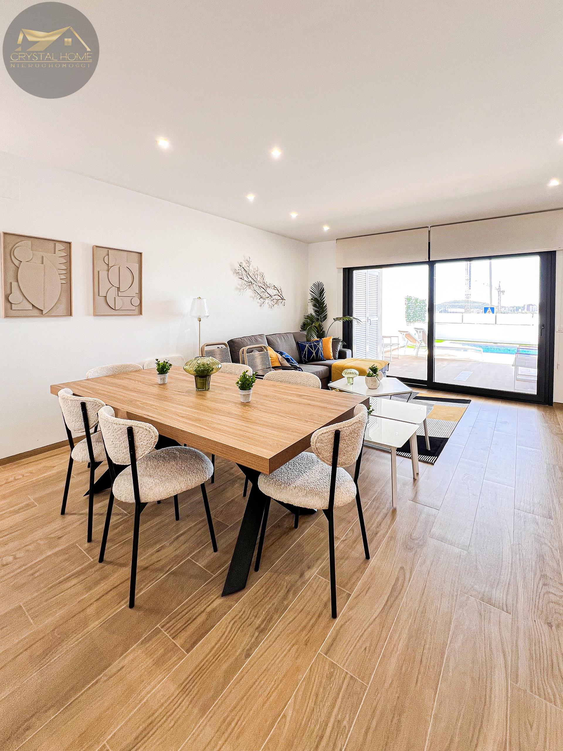 Otwarta kuchnia i salon zapewniają nowoczesne i przestronne środowisko życia. Współczesny projekt pozwala na płynne przejście między przestrzenią mieszkalną i kuchenną, zapewniając idealne miejsce do przyjmowania gości lub spędzania czasu z rodziną.