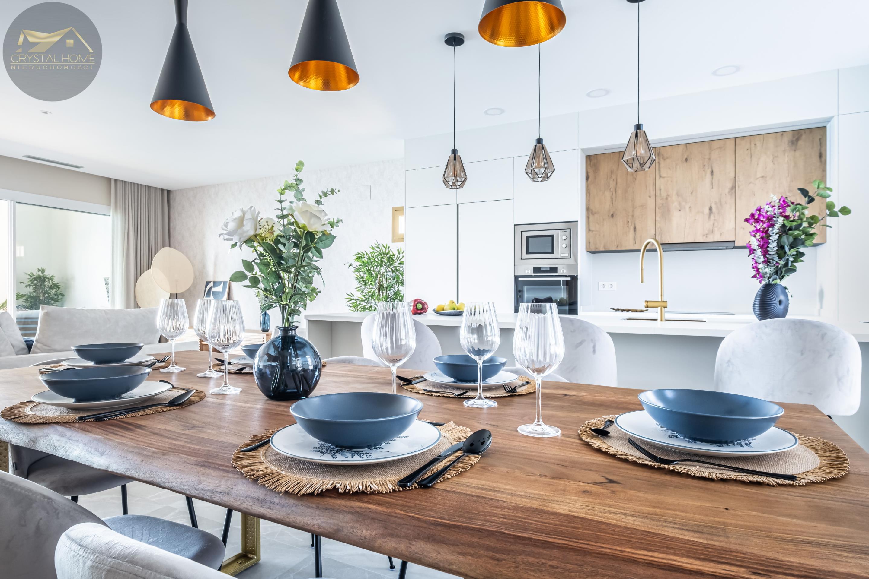 W pokojach znajdują się duże szafy wnękowe z białymi lakierowanymi drzwiami, natomiast kuchnie wyposażone zostały w najwyższej jakości meble oraz sprzęt AGD. Łazienka jest równie stylowa i luksusowa, z wanną z hydromasażem. Nowoczesna instalacja elektryczna i posadzka z kamionki porcelanowej dopełniają całość, tworząc jasną, elegancką i wyrafinowaną