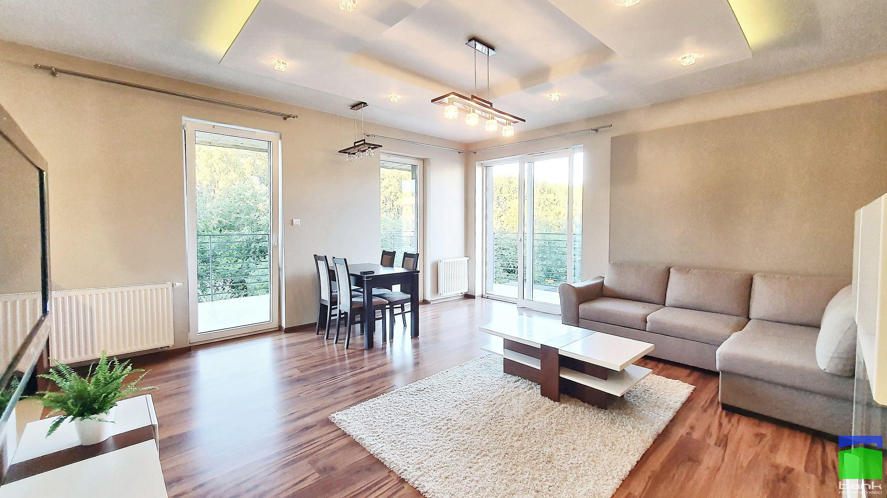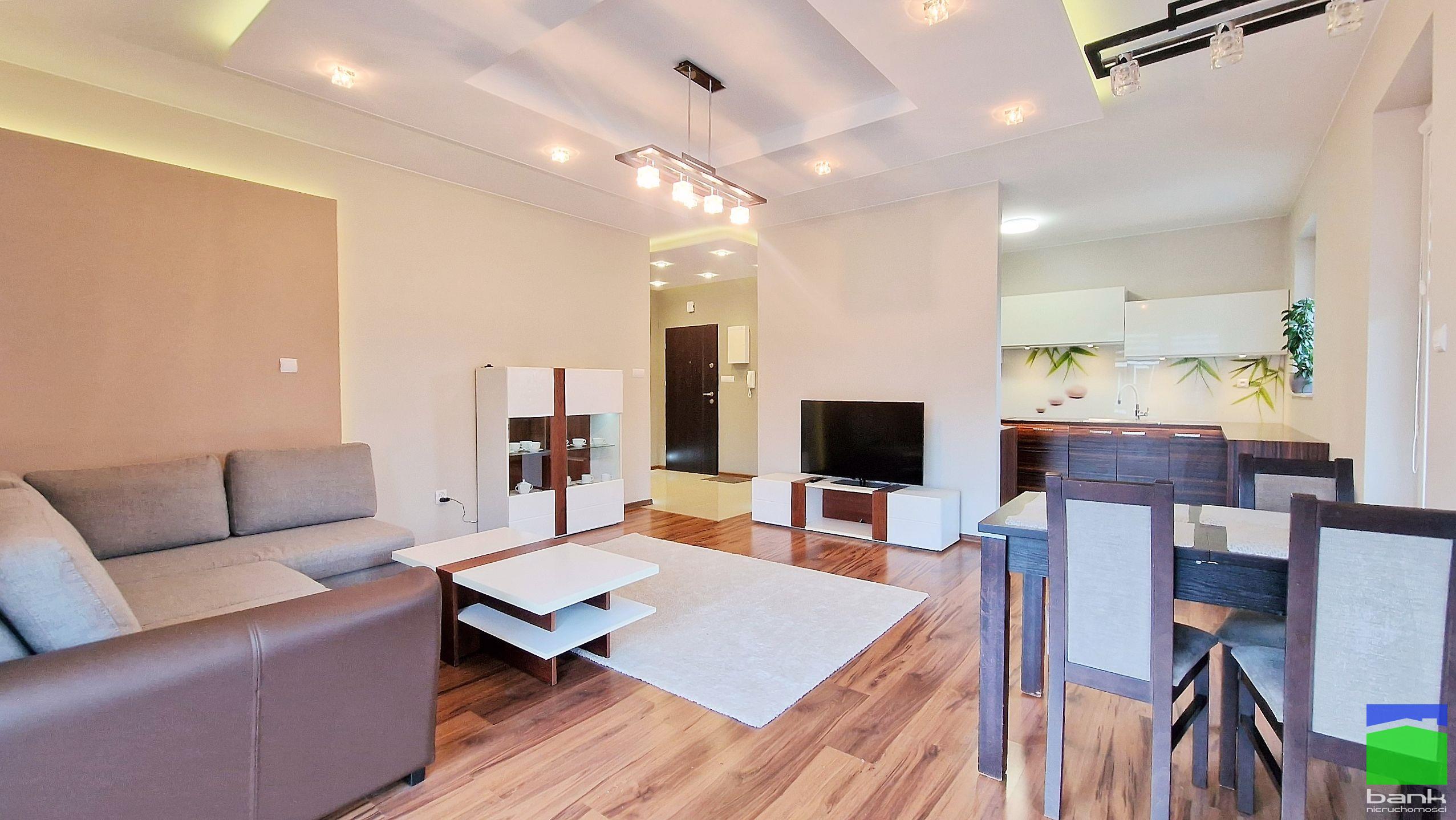 Przestronny salon z aneksem kuchennym, dwa niezależne pokoje.