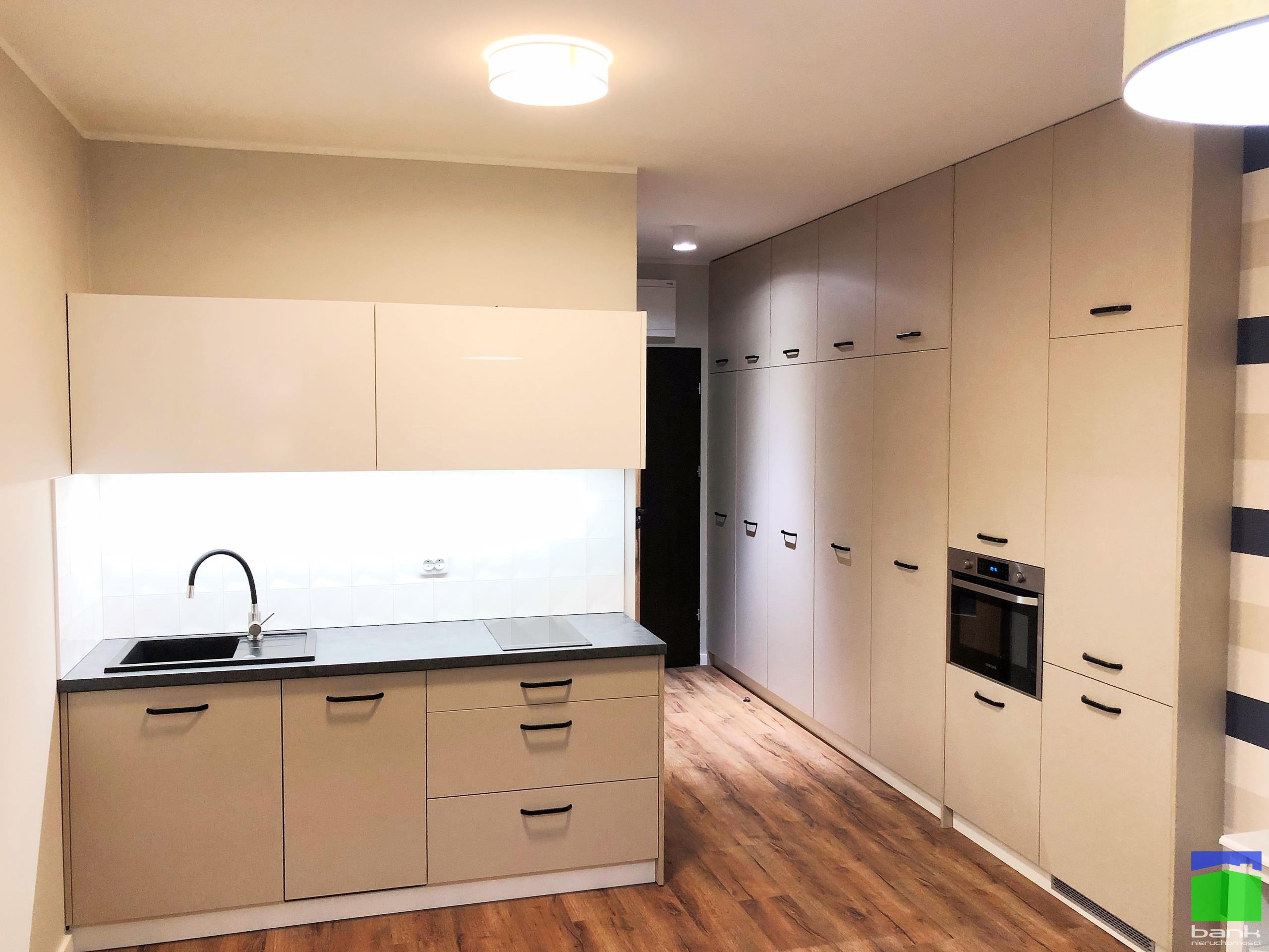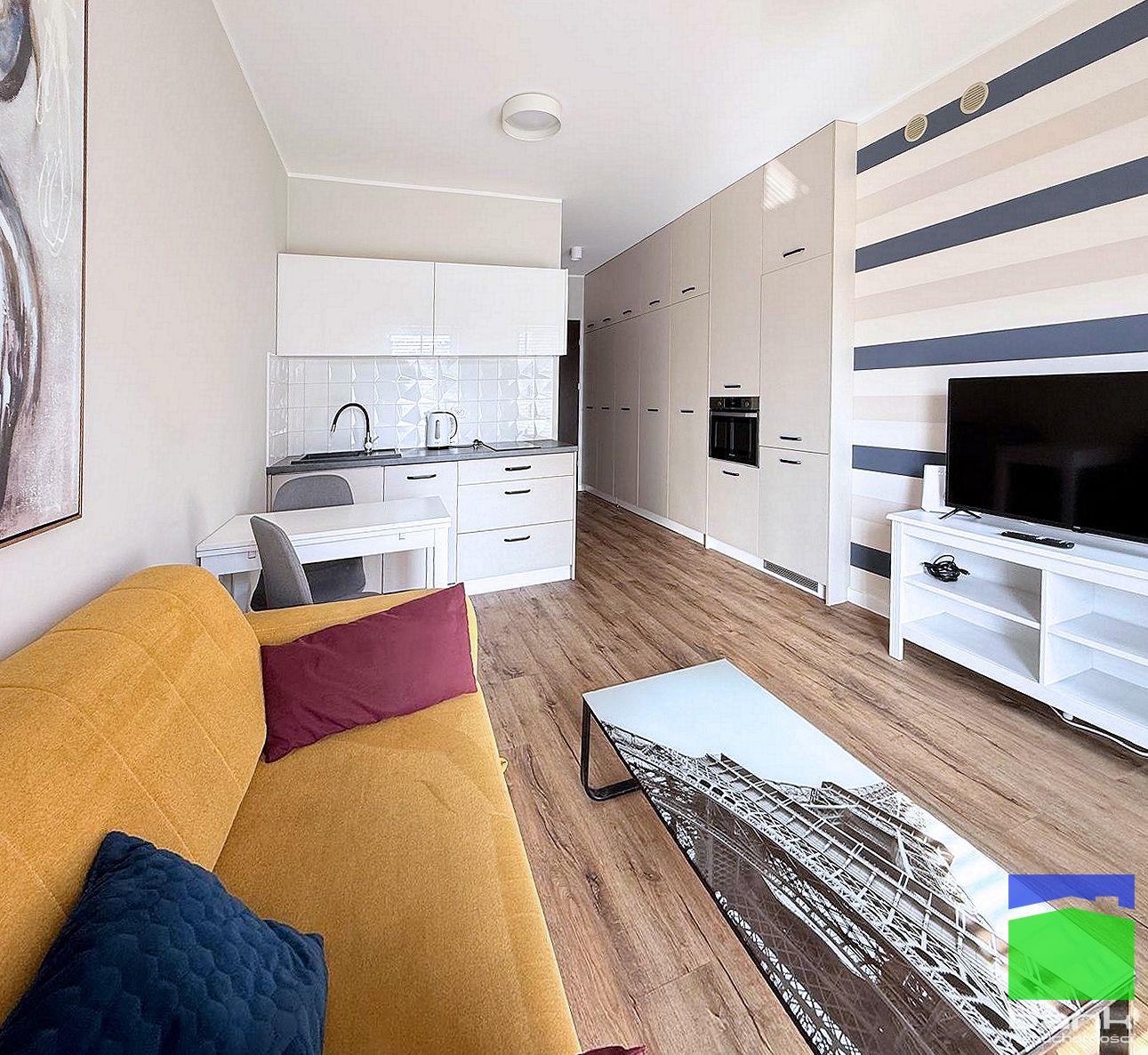 Pokój dzienny z aneksem kuchennym i wyjściem na przestronny balkon.