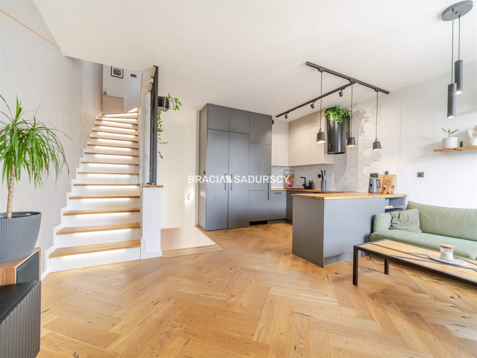 Na piętrze znajduje się salon z aneksem kuchennym i wyjściem na taras, a także pomieszczenie gospodarcze z pralnią. Pierwotnie planowano tu dodatkową toaletę - istnieje możliwość przywrócenia tej funkcji, ponieważ zachowano instalację wodno-kanalizacyjną.
