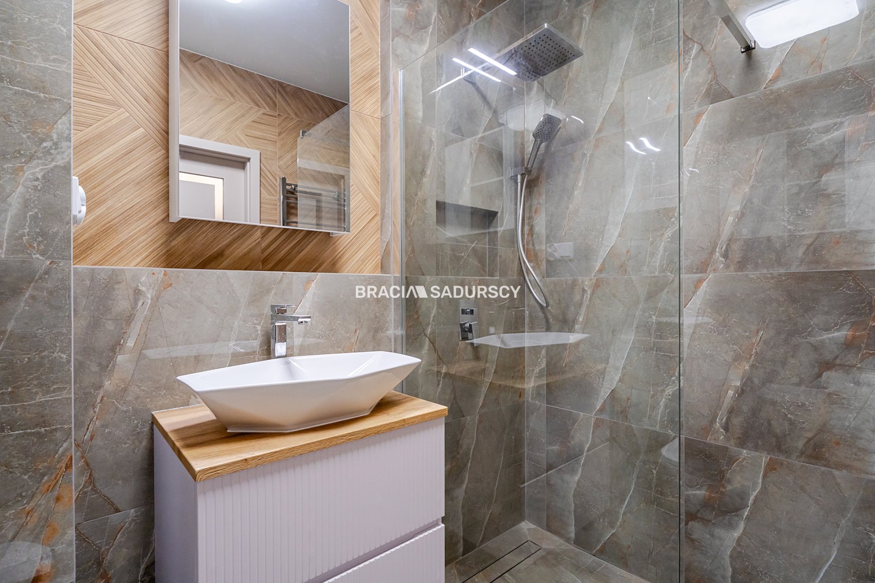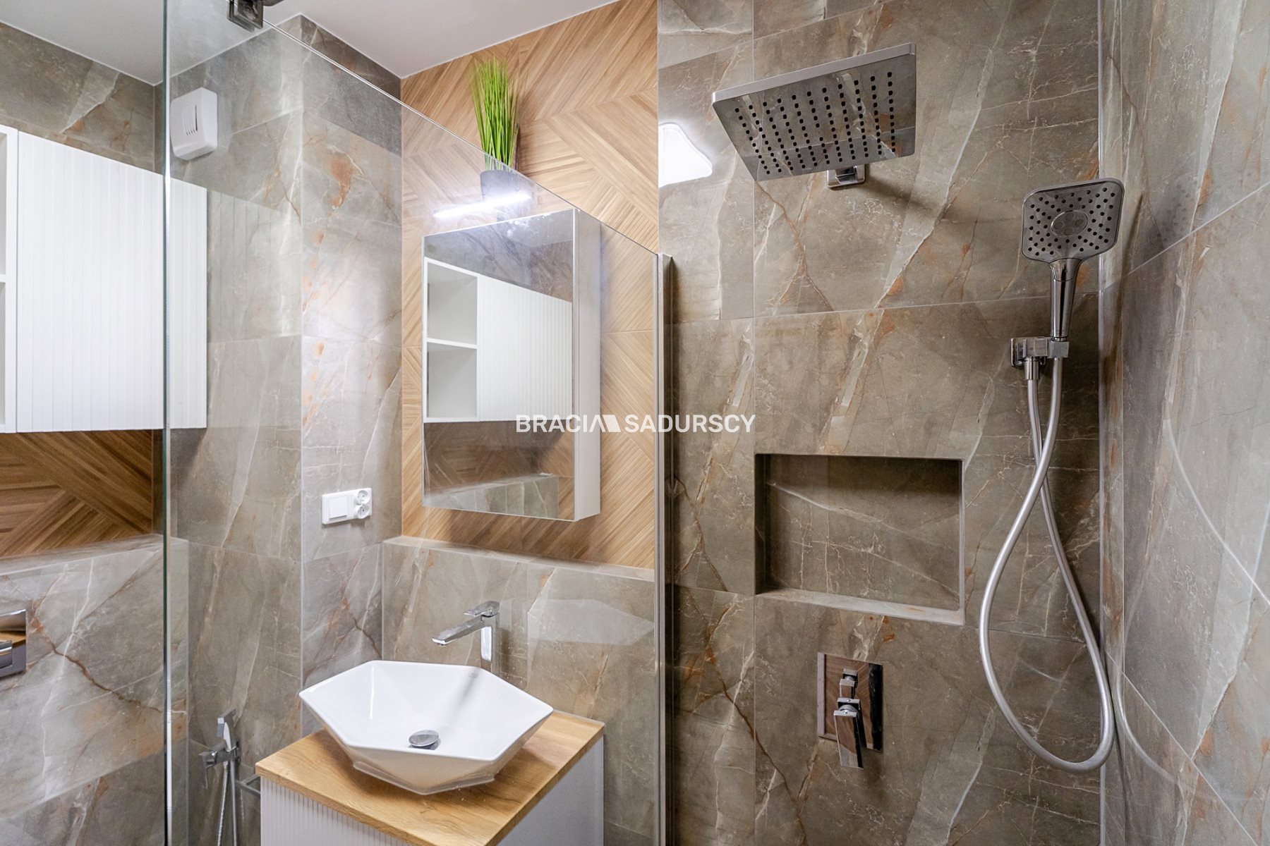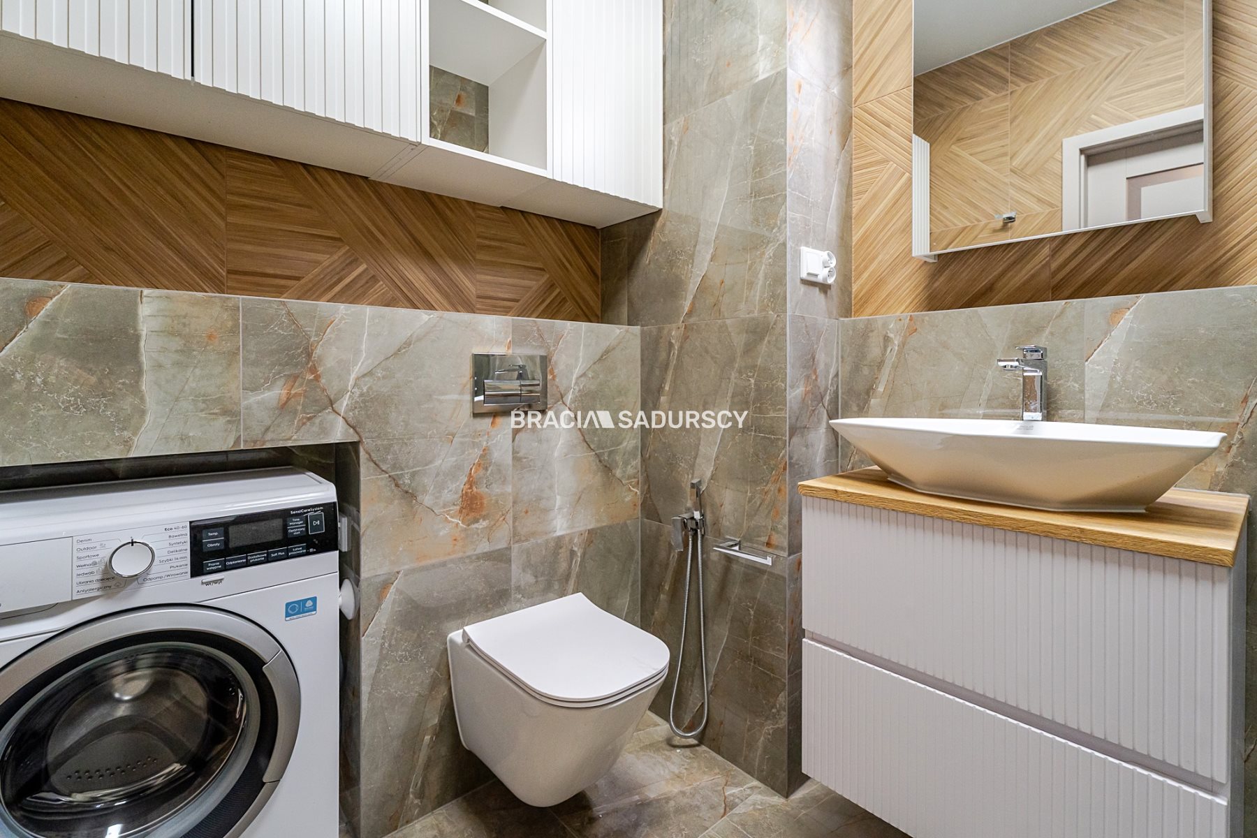 Mieszkanie jest w pełni wyposażone i gotowe do zamieszkania - właściciel zadbał o materiały dobrej jakości i zabudowy na wymiar, aby optymalnie wykorzystać dostępną przestrzeń. Do naszej dyspozycji na miejscu są nowe sprzęty AGD takie jak pralka, zmywarka 45cm, piekarnik, płyta indukcyjna, lodówko-zamrażarka czy okap. Łazienka została wyposażona w kabinę walk-in z deszczownicą oraz słuchawką prysznicową, toaletę z podręczną słuchawką do podmywania, umywalkę z lustrem i szafkami, które ułatwią codzienne zagospodarowanie. W sypialni znajdziemy łoże małżeńskie o wymiarach 200x160cm , oraz optymalnych gabarytów szafę z lustrem. Ściany i podłogi zostały wykończone materiałami o wzmocnionej odporności, takie jak panele klasy 5tej , czy farby zmywalne firmy Flugger , co pozwoli nam na łatwiejsze utrzymanie czystości w mieszkaniu.