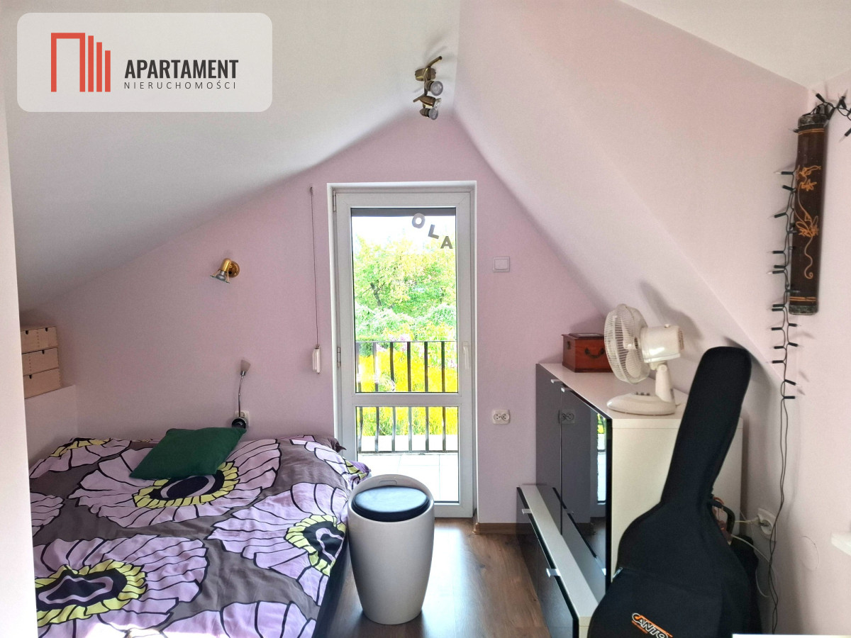 Na piętrze dwa pomieszczenia: antresola oraz sypialnia z wyjściem na balkon.