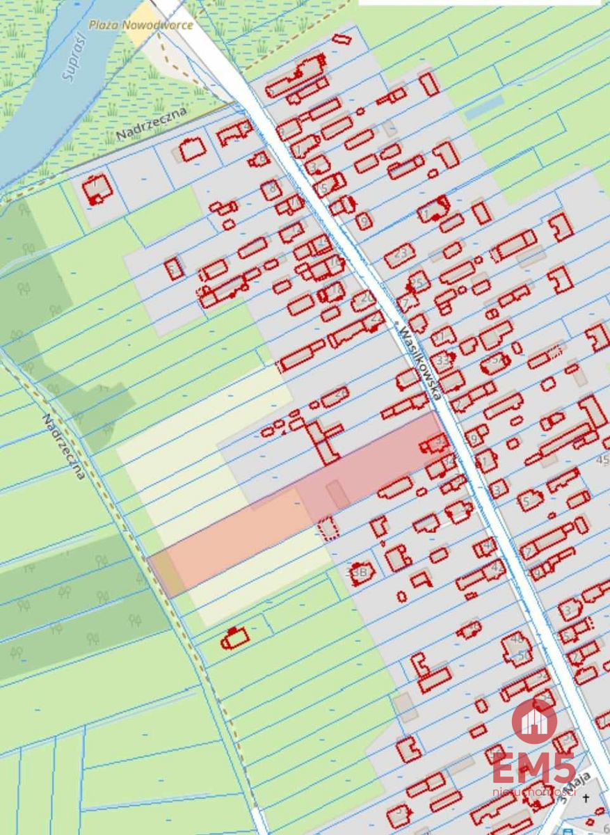 Działka posiada dojazd z dwóch stron od ulicy Wasilkowskiej i Nadrzecznej. Na działce znajduje się dom murowany z 1910 roku, nadający się do generalnego remontu. Dom nie jest objęty opieką konserwatora zabytków. Obecnie 2515m2 stanowi cześć budowlana, pozostała cześć to działka rolna.