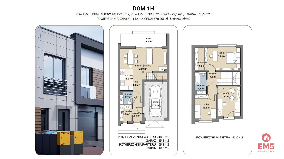 Na parterze znajduje się przestronny salon z aneksem kuchennym ( z wyjściem na ogród), wiatrołap WC oraz garaż.