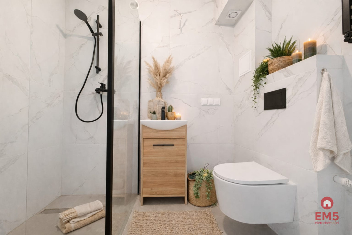 W skład nieruchomości wchodzą: - salon z aneksem kuchennym wyposażony w płytę indukcyjną, okap, zmywarkę oraz piekarnik, - łazienka z prysznicem, WC i umywalką, - pomieszczenie dodatkowe, które może pełnić funkcję garderoby lub drugiej łazienki.