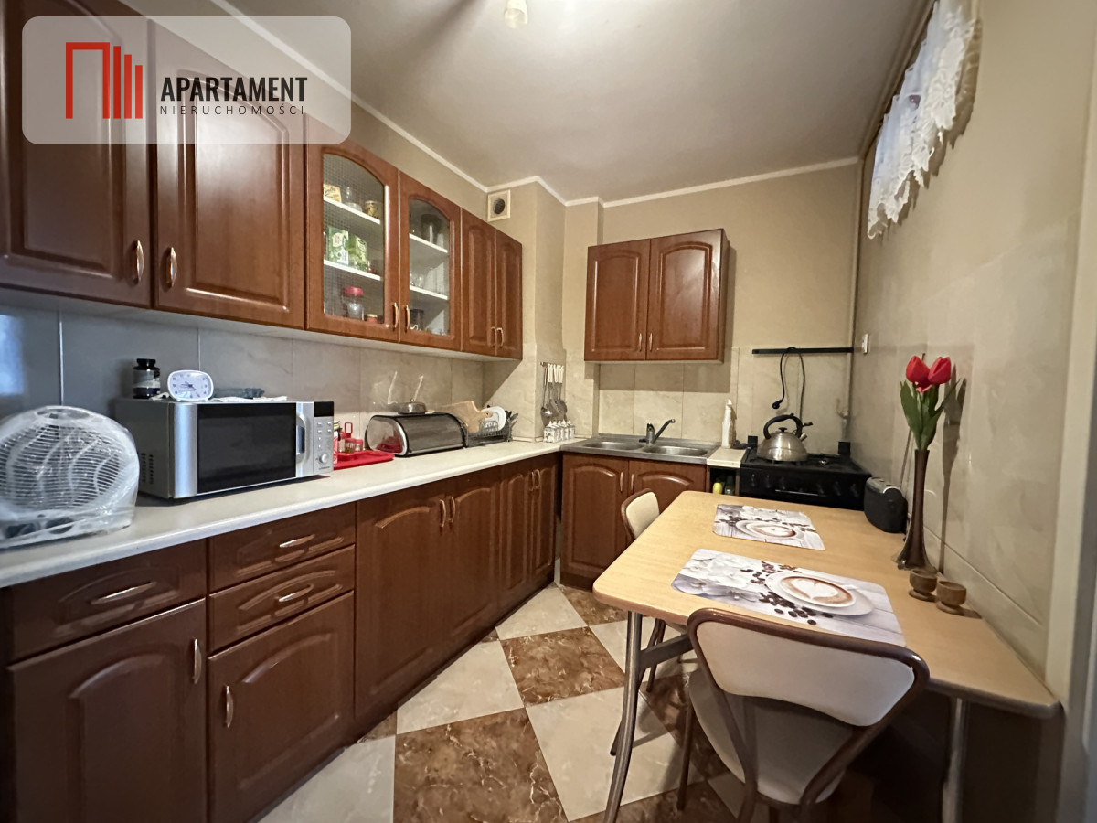 Kuchnia wyposażona w zabudowę meblową oraz niezbędne sprzęty AGD. Całość tworzy spójną i funkcjonalną przestrzeń do codziennego użytkowania.