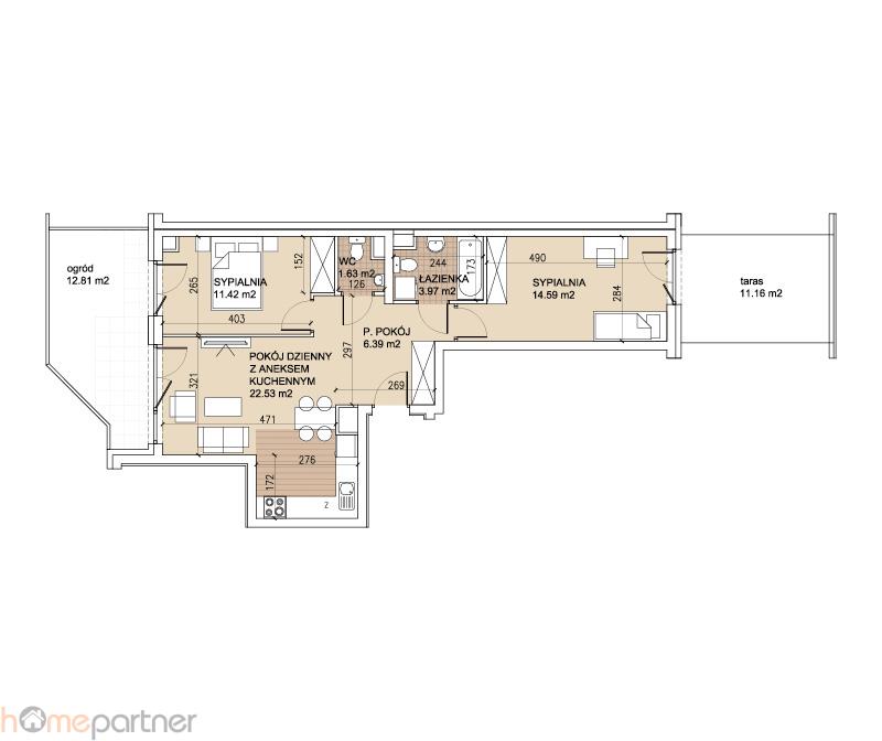 - pokoju dziennego z aneksem kuchennym 22,53 m2