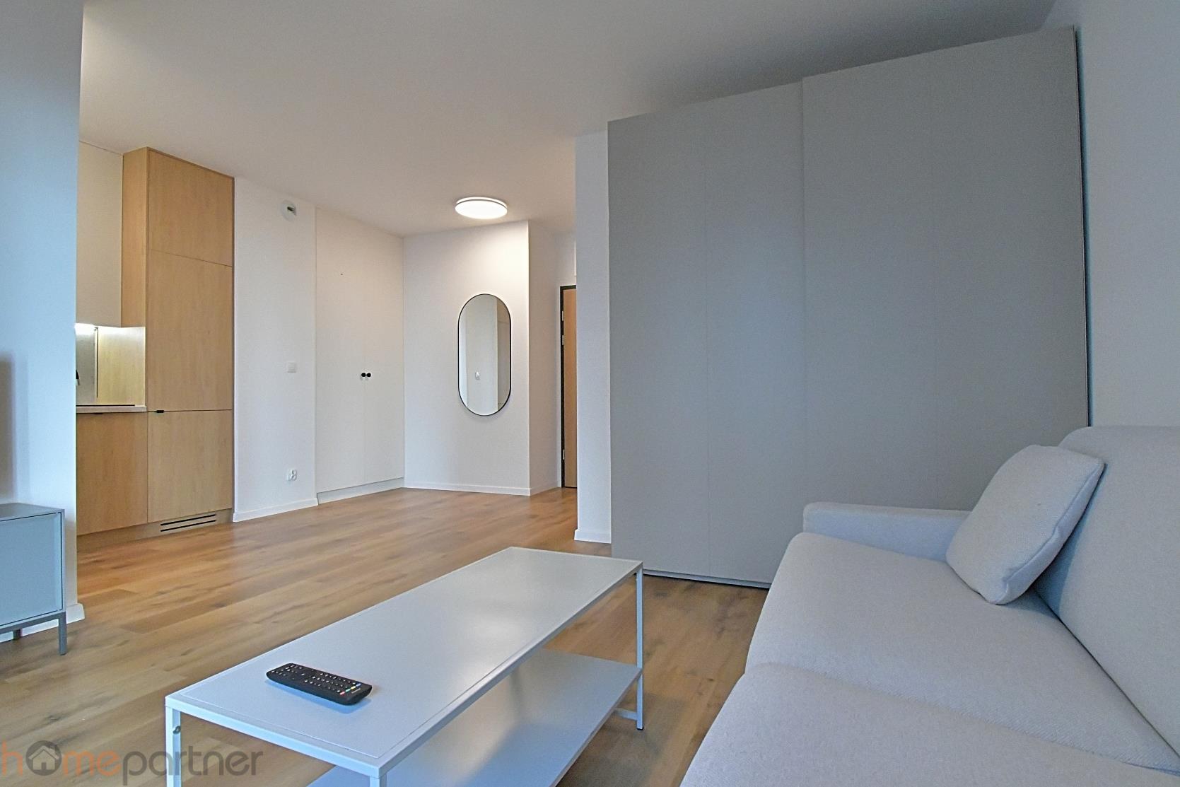 The apartment is furnished, modernly designed, and finished with high-quality materials. The built-in kitchen includes: fridge-freezer, induction, hob oven, coffee machine. The bathroom features a shower and a washer-dryer. The living area includes: a fold-out sofa with a built-in mattress (160 200 cm), table, TV cabinet, Smart TV.