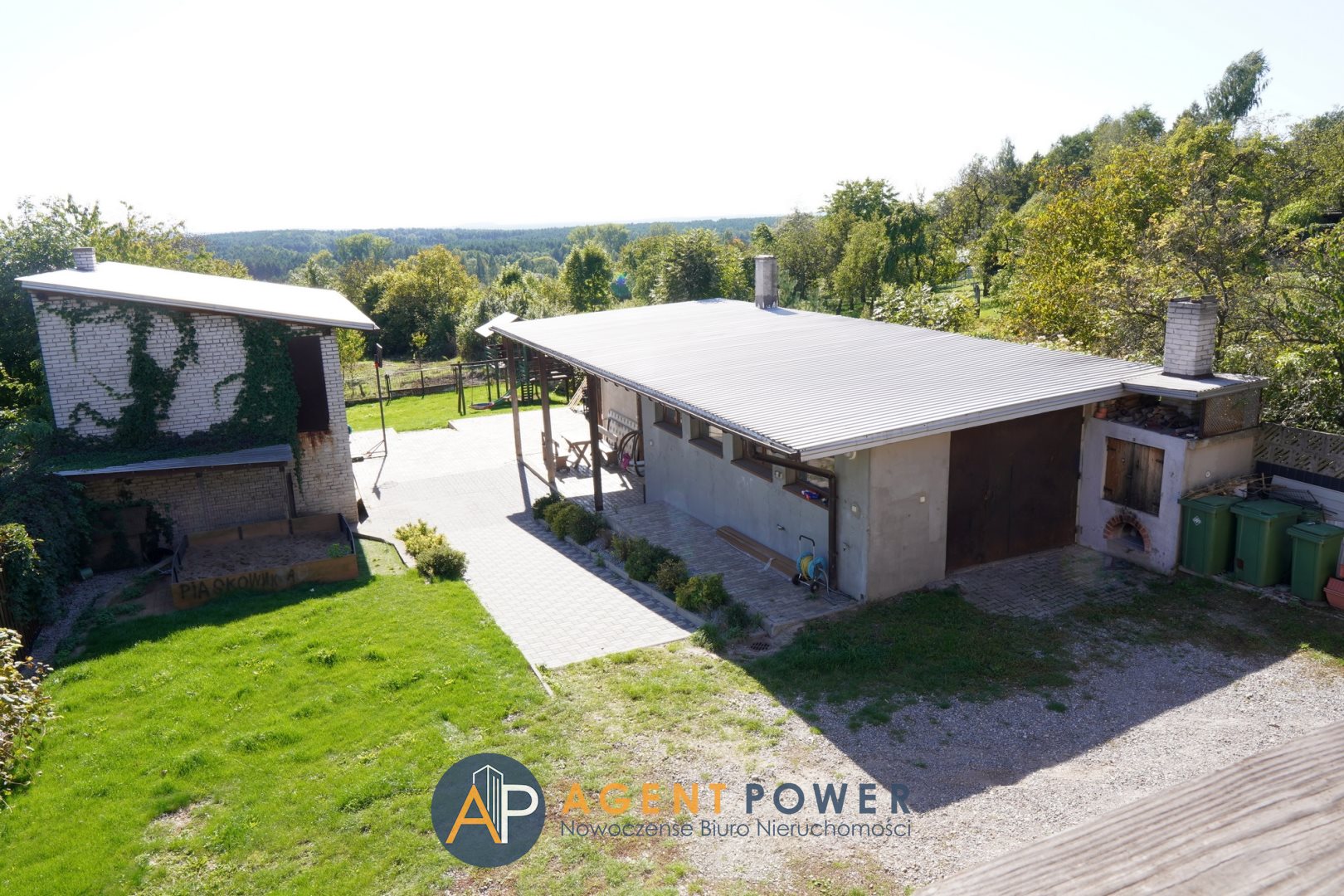 Teren lekko płaski / częściowo zagospodarowany: trawnik, plac zabaw dla dzieci, miejsce na grilla/altanę.
