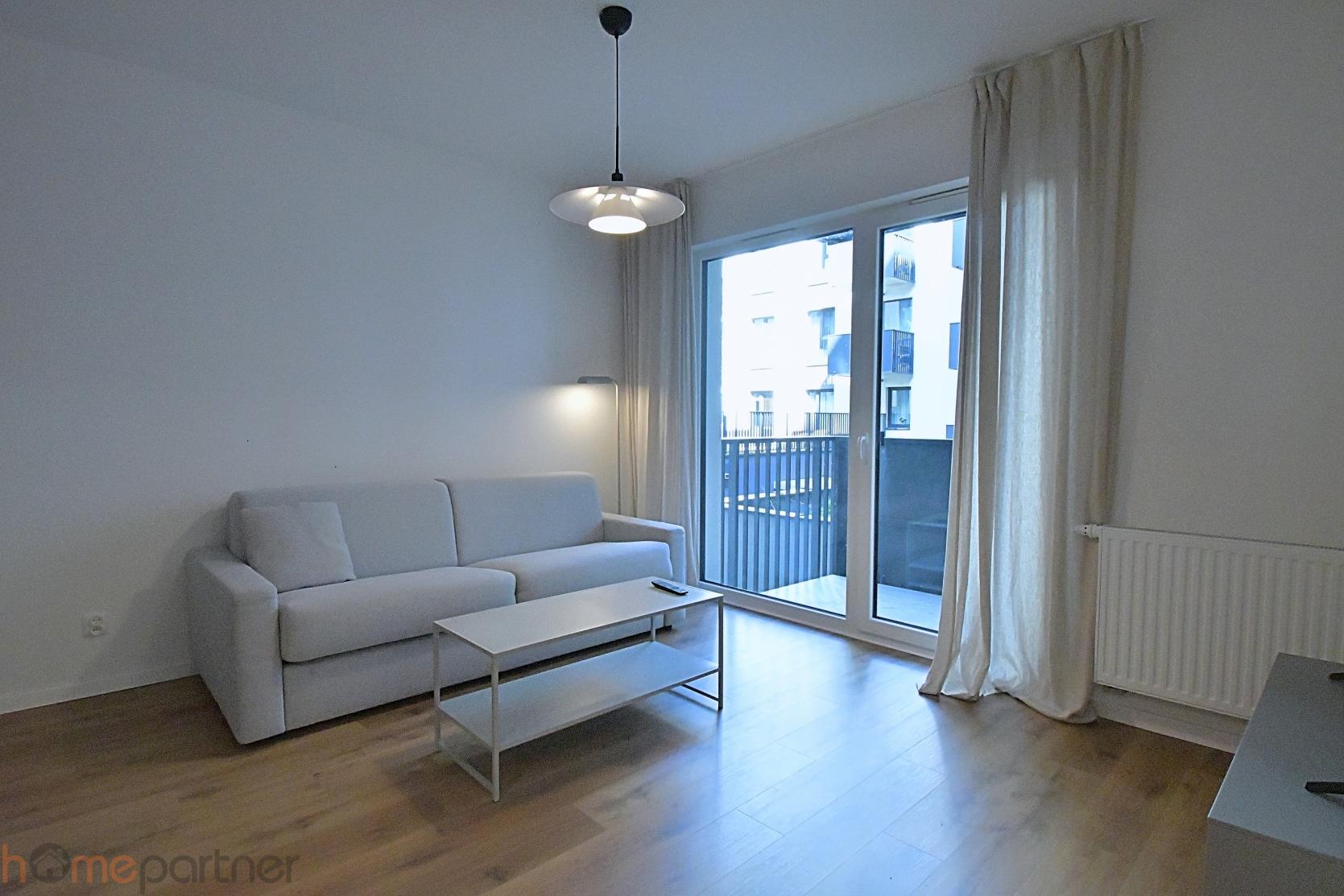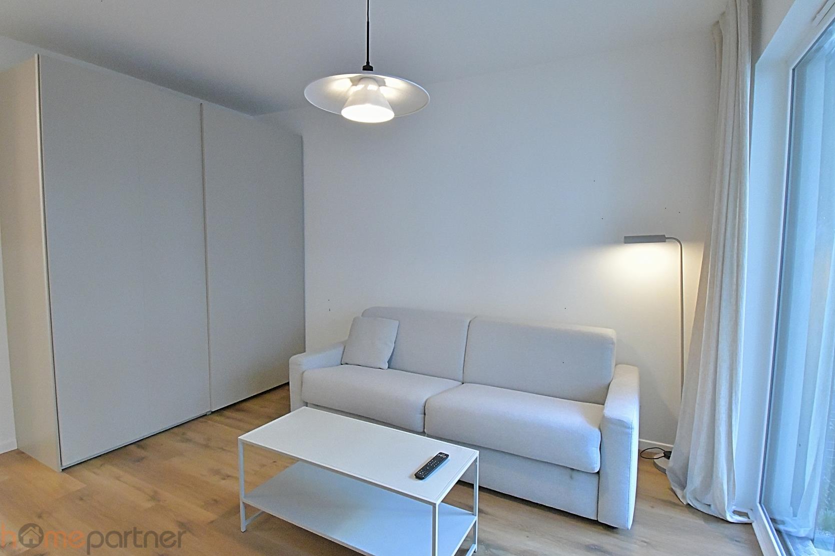 The apartment is furnished, modernly designed, and finished with high-quality materials. The built-in kitchen includes: fridge-freezer, induction, hob oven, coffee machine. The bathroom features a shower and a washer-dryer. The living area includes: a fold-out sofa with a built-in mattress (160 200 cm), table, TV cabinet, Smart TV.