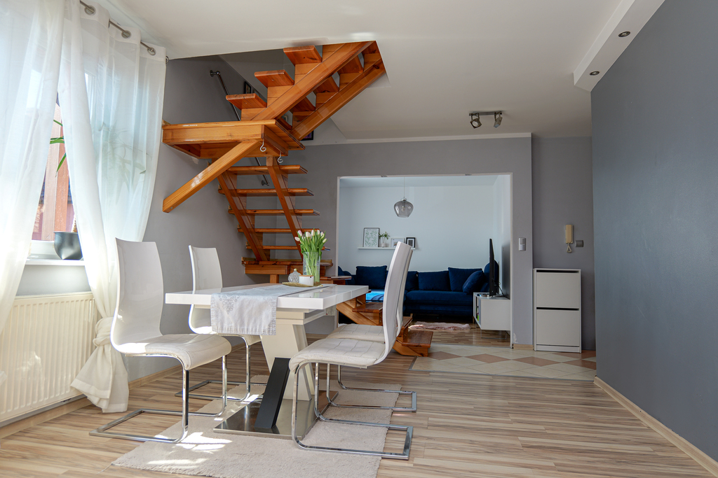 Ogromnym atutem mieszkania są dwa poziomy oddzielając tym samym przestrzeń dzienną od strefy nocnej.
