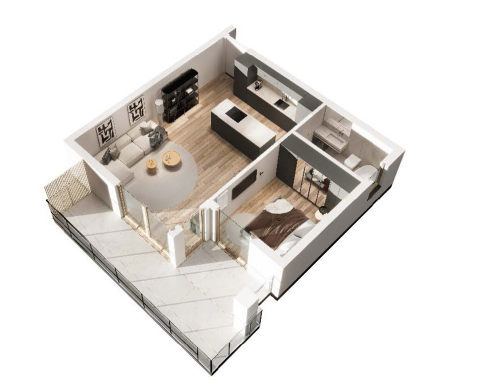 Rozkład pomieszczeń:salon z aneksem kuchennym i wyjściem na taras sypialniałazienka,