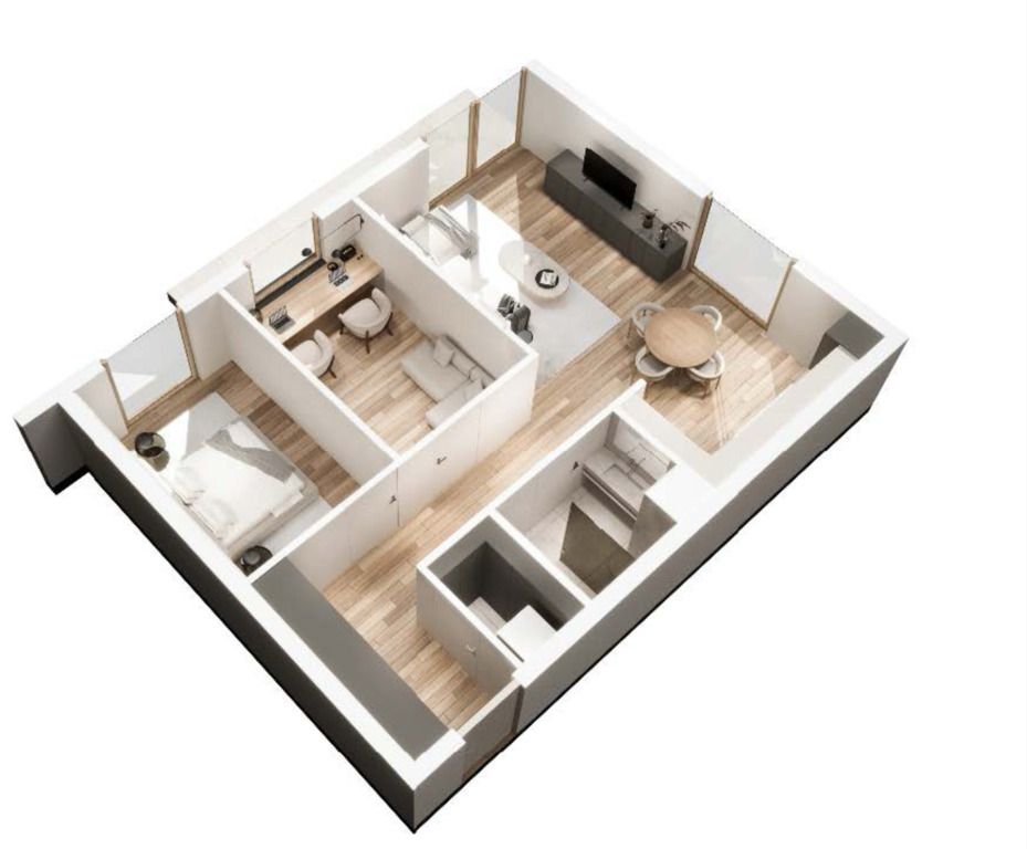 Rozkład pomieszczeń:salon z aneksem kuchennym i wyjściem na taraspokójsypialniałazienka,