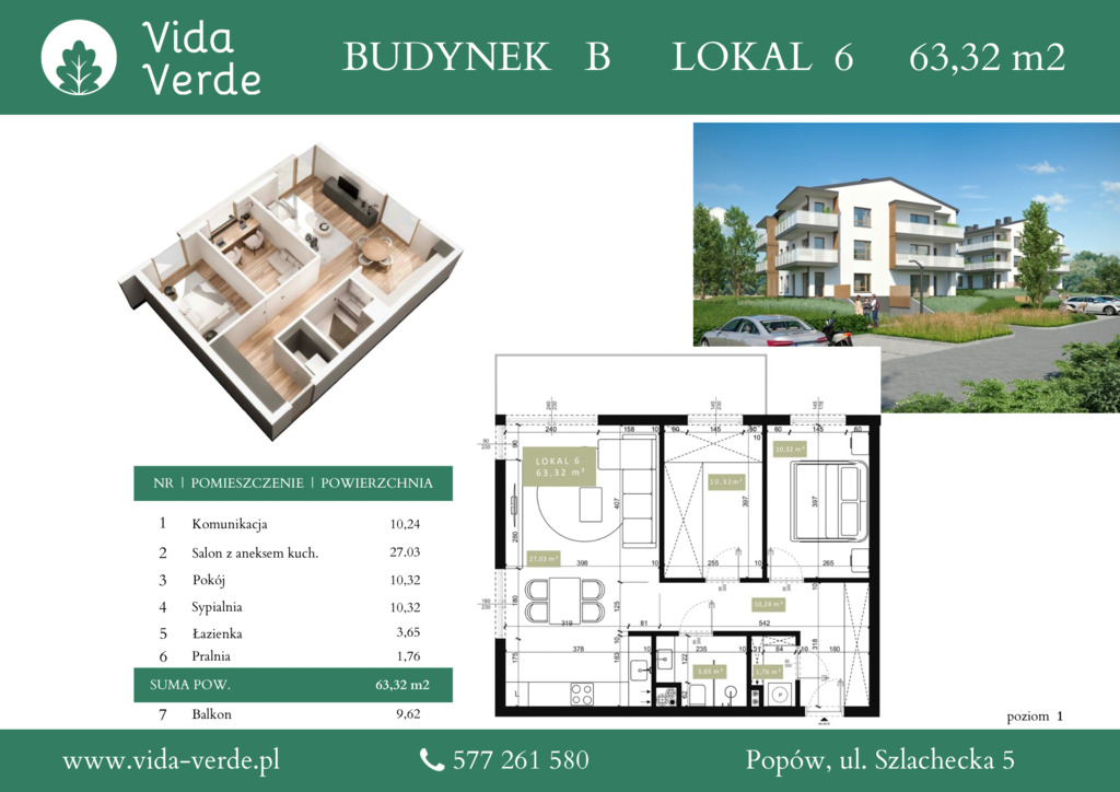 Mieszkanie o pow. 63,32 m² dostępne w budynku A i B 2x parter, 2x 1 piętro, 2x 2 piętro.