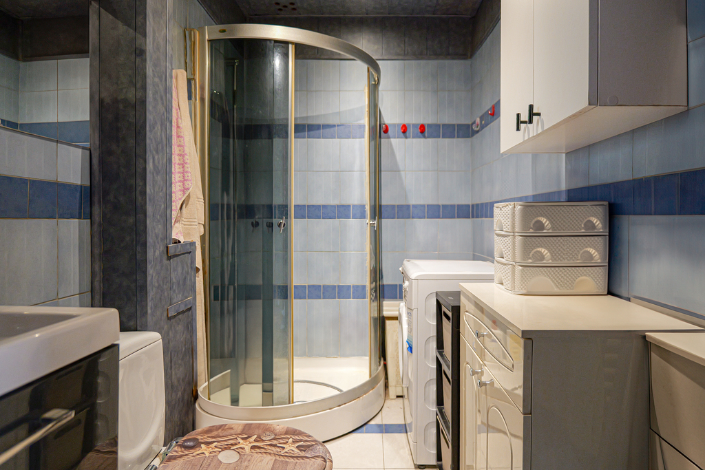 łazienka z prysznicem, pralką, WC, umywalką oraz grzejnikiem,