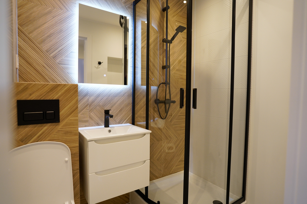 łazienka – nowoczesna, z prysznicem, umywalką i WC,