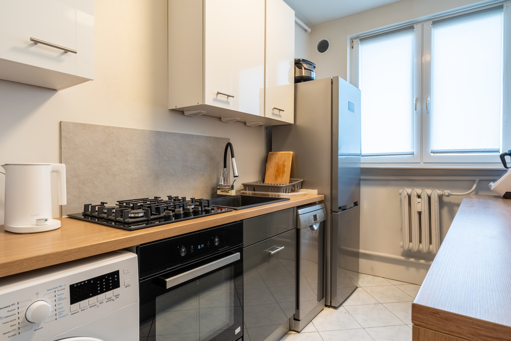 Kuchnia: wyposażona w meble w zabudowie oraz sprzęty AGD (lodówka, pralka, zmywarka, piekarnik, mikrofalówka, płyta gazowa, zlew, zamrażalnik).