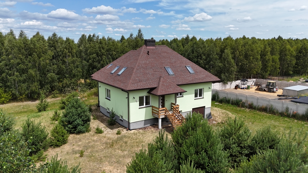 dom o powierzchni całkowitej ~ 340 m², powierzchnia użytkowa ~ 210 m²,usytuowany na działce prostokątnej, pow. ~ 1380 m² (wymiary działki: ok. 27 m x ok. 50 m), ogrodzona siatką,budynek wykonany w technologii tradycyjnej z pustaka kratówki max, dach czterospadowy pokryty gontem bitumicznym, okna drewniane – nowego typu, drzwi wejściowe antywłamaniowe, poddasze użytkowe,dostępne media: prąd, woda, kanalizacja miejska, ogrzewanie – pompa ciepła, piec na biomasę, siła,bezpieczeństwo: alarm oraz monitoring,powierzchnie dodatkowe: garaż pod budynkiem, piwnica, pralnia, spiżarnia oraz 1 klasyczny balkon.