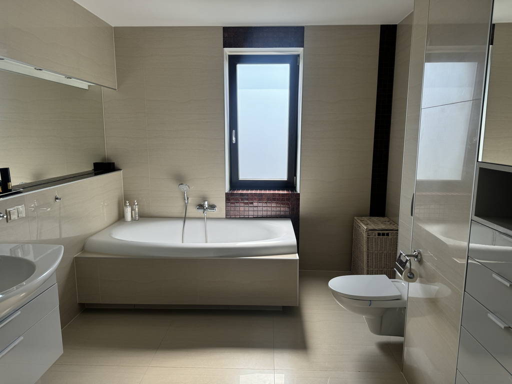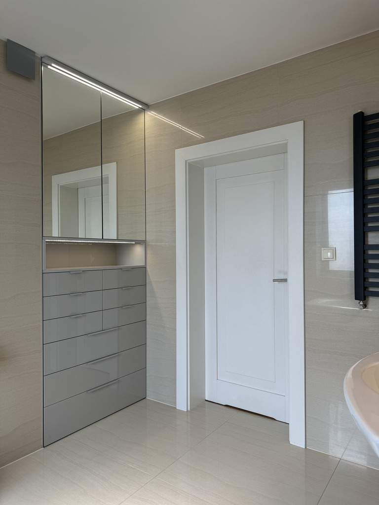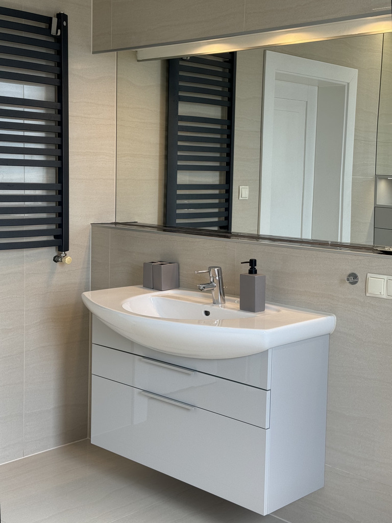 2 łazienki z pełnym wyposażeniem (prysznic, wanna, WC, umywalki, grzejniki drabinkowe), widna kuchnia z zabudową meblową oraz wyposażeniem: lodówka, piekarnik, okap, zmywarka, płyta elektryczna.