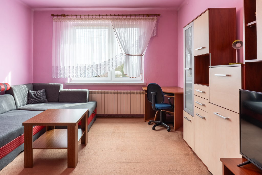 4 pokoje – w tym sypialnie oraz pokój dzienny, 2 łazienki (wyposażenie : pralka, wanna, WC, grzejnik oraz okno, kuchnia widna z wyposażeniem (meble, lodówka, okap, kuchenka), strych nieużytkowy.