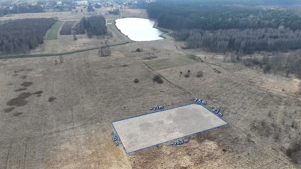 powierzchnia: 2139 m² (ok. 76 m x 27 m),kształt: nieregularny (zbliżony do prostokąta),ukształtowanie terenu: płaskie,media: woda, prąd – w drodze głównej,dojazd: droga polna.